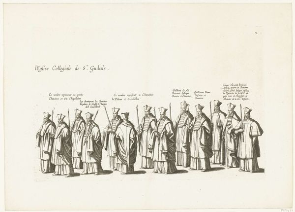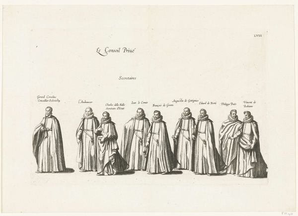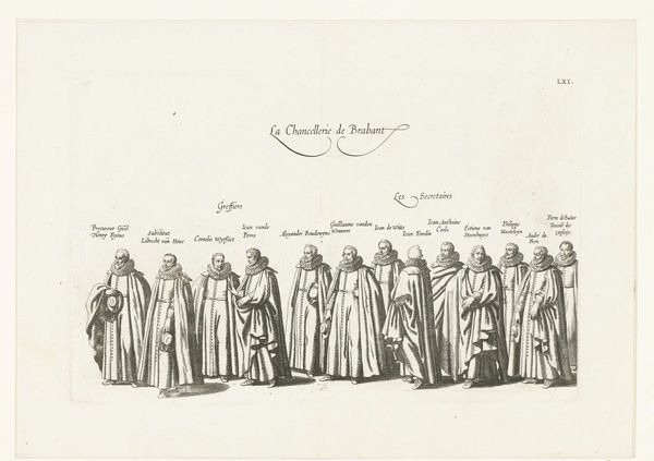 This is "Begrafenisstoet van aartshertog Albrecht," an engraving made in 1622 by Cornelis Galle I. It depicts the funeral procession of Archduke Albert, dominated by the solemn figures of chamberlains, guards of the dames, and guards of the joys. Observe their cloaks and collars, symbols of status and mourning. This uniform, worn by figures of authority, has roots that reach far back through history, and remind me of similar symbols in other works of art. These outfits bear a resemblance to ceremonial robes worn by figures in classical antiquity. The repetition of figures, draped in similar garb, conveys a powerful sense of collective grief. It resonates deeply with the primal human experience of loss, tapping into a shared subconscious understanding of death and mourning. These symbols echo across centuries, reappearing in various forms and contexts. These visual motifs evolve, adapt, and are continually reinterpreted through the lens of successive generations.