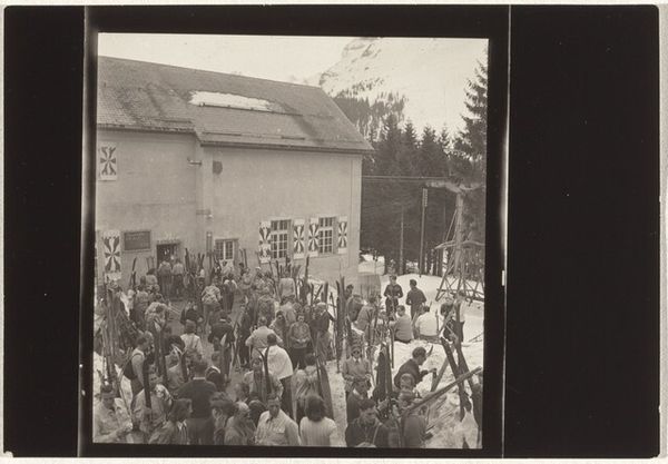 Editor: This is "Untitled (Hawaii)" by Bill Dane. It's a black and white photograph, quite small. The texture of the image is so rich, especially the contrast between the dense foliage and the bright clothing of the crowd. What do you see in the organization of elements here? Curator: Note how Dane employs the formal elements of line and form to create a complex interplay. The horizontal lines of the benches provide a structural base, contrasted with the verticality of the trees. Do you observe how the artist uses light and shadow to direct the eye? Editor: Yes, the way the light filters through the trees creates these patterns that almost obscure the figures, flattening the space. Curator: Precisely. The semiotic significance of this can be debated, but its formal impact is undeniable. This photograph’s composition creates a tension between clarity and obfuscation. Editor: This has given me a lot to think about regarding the artist's compositional choices. Curator: Indeed. It is in this formal tension that the photograph discovers its power.