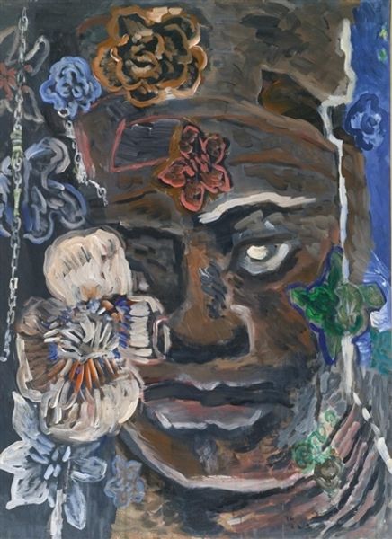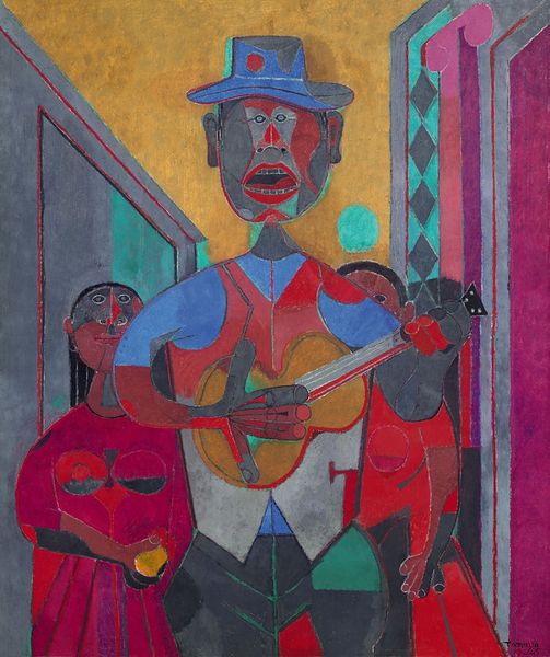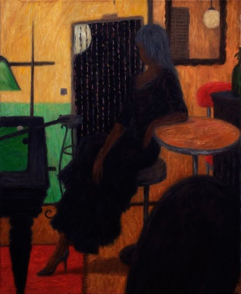 Editor: Here we have "Sybel No. 2," a 1942 painting by Oronzo Vito Gasparo, created with acrylic paint. There’s a quiet domesticity to it, yet also something a bit unsettling. How do you interpret this work? Curator: Gasparo’s portrayal of Sybel really resonates within the historical context of 1942. It’s impossible to separate this intimate scene from the sociopolitical landscape of the time, especially regarding racial representation and the gaze. What do you notice about her posture and expression? Editor: She seems rather stoic, almost defiant. She isn't smiling or inviting. Curator: Exactly! Consider the expectations placed upon Black women in the 1940s. This isn’t just a portrait; it’s a statement. Gasparo, intentionally or not, subverts those expectations. Her gaze seems to challenge the viewer. And consider the repetitive patterns; they evoke a sense of both comfort and confinement. Editor: That makes me wonder about the "naive art" tag. Is it fair, or does it diminish Gasparo's potential commentary on race and gender? Curator: It’s a loaded term, isn't it? Often used to marginalize artists who operate outside of traditional academic training. However, I would argue it may allow for more unfiltered narratives to come through, even if those weren't intended or completely realized. "Naive art" has become a genre in itself. Ultimately, it's about who is doing the labeling and why. Editor: That’s fascinating. So it encourages me to look deeper at how societal power structures play into what we consider to be high or low art? Curator: Precisely! And how those categories impact our understanding of the artist's intent, their voice, and the stories being told. It’s about decentering established art historical narratives. Editor: I never would have considered those ideas at first glance. Now I have a lot to think about!