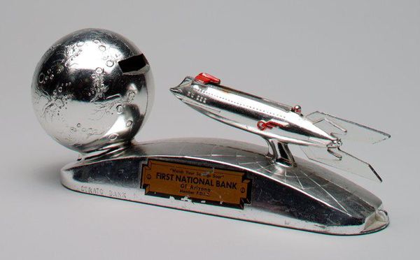 Curator: Here we have the "-Tank and Cannon- mechanical bank," dating back to around 1920, currently residing here at the Minneapolis Institute of Art. It's quite a piece of history, an assemblage primarily composed of metal. Editor: Immediately, there’s something disarmingly whimsical about it. All that cold, hard metal shaped into something that was intended to receive… spare change. And is it supposed to have some sort of action to it? Like the coin somehow makes the tank "fire?" Curator: Precisely! It's a wonderful object, really. The way the makers used industrial materials for something playful intended for the home and, probably for kids. Reflects this very specific historical moment, after the war when these machines of war, were also sort of normalized and integrated into popular culture, like with toys or money saving devices. Editor: It makes me consider childhood during the interwar period… the innocence tinged with awareness of global conflict. Curator: Absolutely. Consider how that tank is fabricated— likely by low-wage laborers—juxtapose it against the purpose. Children literally feeding into the machine, this object that simultaneously evokes saving, aspiration, and a kind of military prowess. I also think it would be interesting to think about whether children played differently with this object, understanding more, or less, than we might about its militaristic imagery, Editor: It strikes me, looking at the wear and texture, that each one of these was different – a world away from mass-produced plastic toys of today, so you think this "coin slot warfare," actually resonated in a deep way in their games, given recent realties. Curator: Interesting perspective. The artist who fabricated this bank likely engaged directly with the post-war socio-economic dynamics by producing, reproducing and giving value and accessibility to its militaristic shape. Editor: Definitely food for thought. This whimsical piece becomes rather sobering upon closer inspection. Curator: Indeed, and that intersection is key to its continuing resonance. Editor: I can't say I'll ever look at a piggy bank the same way.