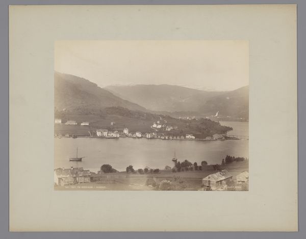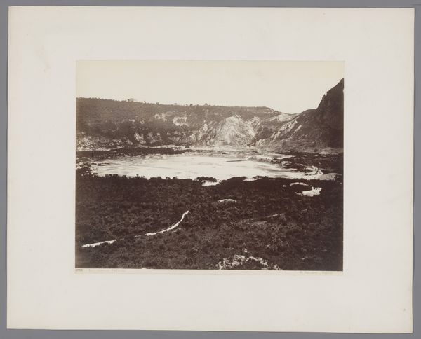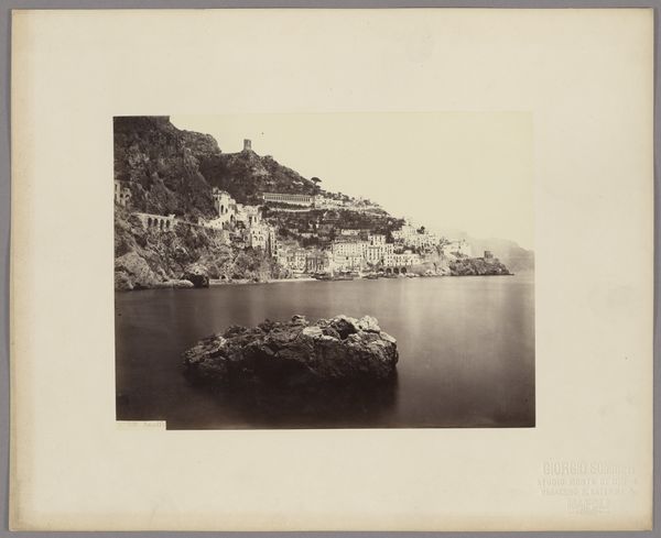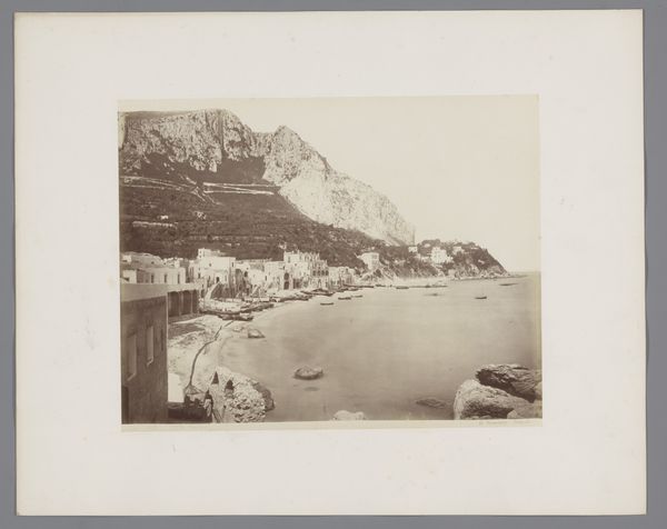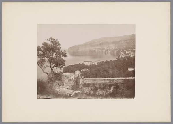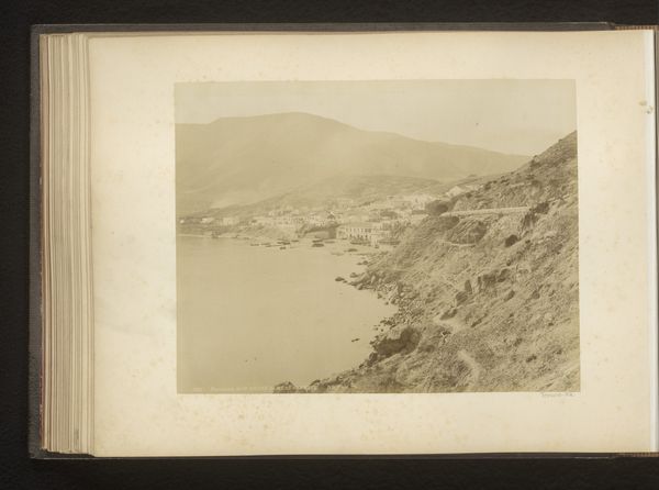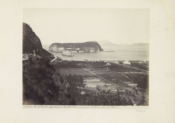 Curator: This is "Gezicht op het eiland Nisida in de golf van Napels, Italië," a captivating albumen print created sometime between 1857 and 1914, part of the Rijksmuseum's collection. What strikes you most when you first see it? Editor: Oh, that moody light! It's as if a memory, a hazy, antique vision is laid out before me. I'm getting a pensive feeling, like stepping back in time on a still, silent day. Curator: Absolutely, and the albumen process contributes so much to that feel. We can see in the tonal range, how the artist, Giorgio Sommer, uses chemistry to control depth, the way highlights pop against shadows that help make the land seem monumental. The sharp lines give way to muted tones as we move farther out to sea. It also showcases the expansion of photographic reproduction and dissemination. Editor: The road snaking up that cliff-face makes me wonder who was doing the building. Were they happy about it? How many lives were altered? How did their tools function, the means to produce such changes? One imagines the laborious work on-site and in studio processing these massive images in dangerous chemicals, not for 'art' exactly, but something that became that. Curator: Those are keen observations. Certainly, this landscape speaks of changing infrastructure of the nineteenth century as well as its visual culture. Consider also that Sommer operated a successful studio catering to tourists eager for views like this—images documenting their travels and experiences, reproduced by the score! What kind of materials are used for preservation? How does this photo come down to us in the digital space? What effect is made to see a vintage print in an era defined by digital imagery? Editor: Seeing it now, filtered through screens, there's an additional layer of temporal remove. I’m taken with the tension in the photo; there's so much nature and agriculture represented along with industry on that distant shore. One cannot visit without causing an effect. Curator: A delicate dance between nature and culture, perfectly captured through early photographic technology... A prescient comment, perhaps, for our own time! Editor: Precisely! So much in a single, layered, evocative photograph.