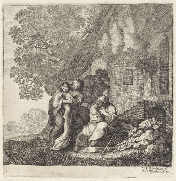 Editor: This is Moyses van Uyttenbroeck's "Return from Egypt", a delicate etching. The density of lines creates a unique texture. What do you observe in its formal qualities? Curator: The composition is particularly striking. Note how the artist uses varying line weights to create depth and shadow. Observe the contrast between the dense foliage and the sparse background. Editor: The figures seem almost secondary to the landscape. Curator: Precisely. The human form is integrated into the larger pictorial structure, not dominating it. See how the lines of the figures mirror those of the landscape around them? Editor: I see that now; it is as if the figures are born of the landscape. Thank you for pointing that out! Curator: My pleasure. Considering these elements allows us to understand the internal logic and structure of the print itself.