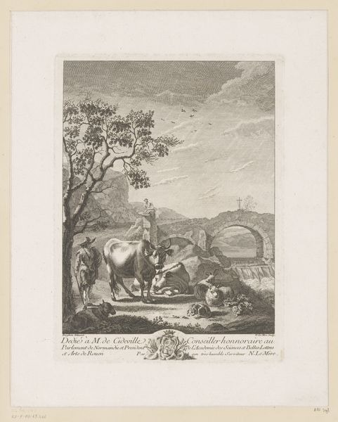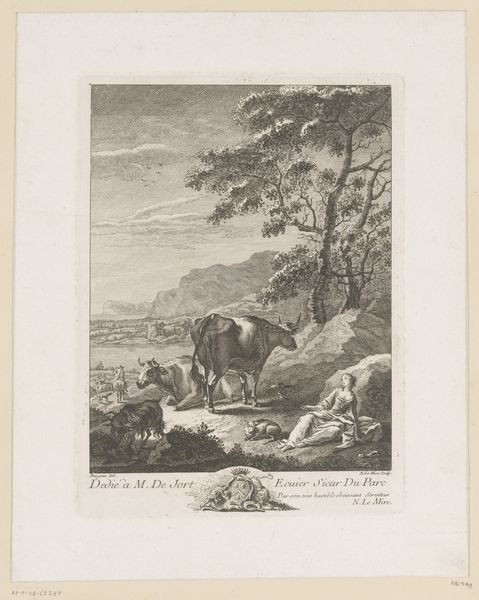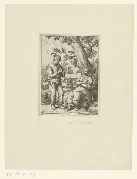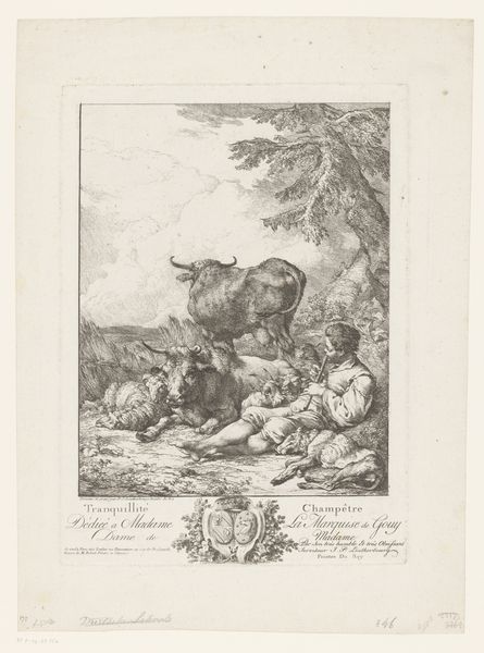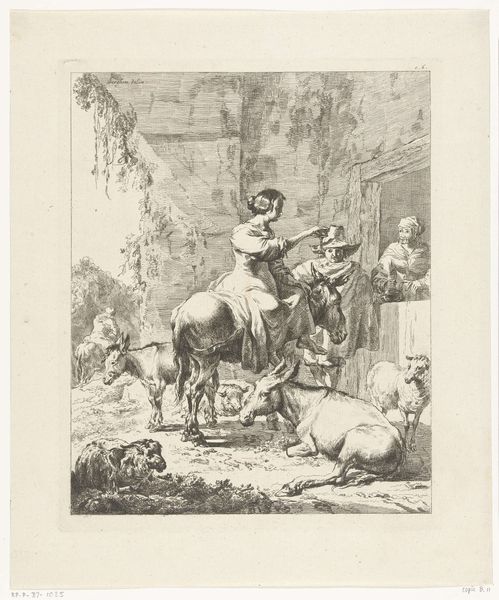 Curator: Here we have Philipp Jacques Loutherbourg's "Meisje met een kind in een stal," which translates to "Girl with child in a stable," an etching produced sometime between 1708 and 1812. What’s your initial read on this image? Editor: It feels remarkably intimate, doesn't it? Despite being set in a humble stable, there’s an undeniable sense of calm domesticity and even tenderness permeating the scene. It seems like an attempt to ennoble what would have otherwise been considered peasant life. Curator: Precisely. Observe how the linear precision and tonal gradations are handled. Loutherbourg carefully articulates depth. He uses the etched lines to direct the viewer’s gaze successively across the plane, with a focalization on the maternal figure. Editor: I agree, though I find myself wondering about the intended audience. Is Loutherbourg idealizing rural life for the consumption of an urban, possibly aristocratic, clientele? Is there a subtle commentary embedded within this seemingly idyllic tableau? Curator: That's plausible. Considering the Baroque influences at play, notice how Loutherbourg constructs a harmonious composition via careful control of balance and contrast. The stable setting also lends the figures monumentality despite the print’s actual diminutive size. Editor: And yet, it strikes me as more than a straightforward celebration of rural virtue. There's a fragility there, a sense of vulnerability in the young mother's gaze. Perhaps reflecting the precarity of rural existence and also an awareness of a societal gaze that both romanticizes and devalues it. Curator: Your points highlight fascinating tensions at play, as it invites nuanced interpretations regarding genre painting's ability to simultaneously reflect and shape social values through compositional cues. Editor: Absolutely. It serves as a potent reminder that what appear as neutral portrayals are often deeply encoded with historical and political complexities. This piece opens so many discussions about visibility, representation, and the lives of women during that time.