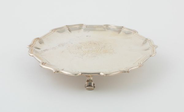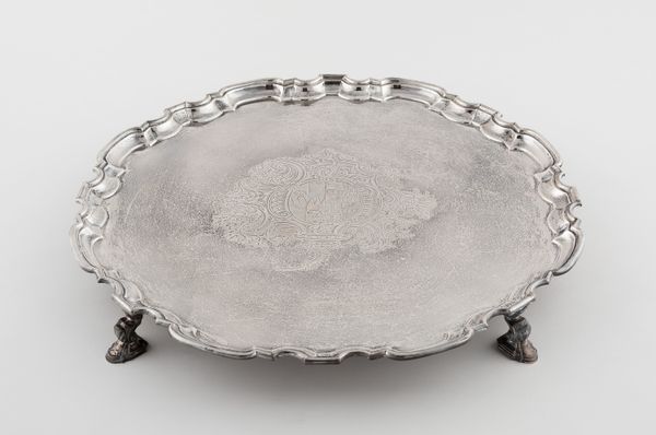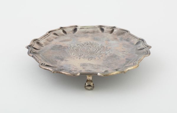 Editor: This is a “Tazza,” crafted from silver around 1697 or 1698. I find it fascinating, it’s got such a formal shape, but feels very simple at the same time. What stands out to you? Curator: It’s the tension, isn't it? This gleaming baroque-era objet is meant for display, pure theater, but now, centuries later, it holds ghosts, secrets. Like holding the last whisper of a forgotten feast. What stories could this old silver server tell, I wonder? Editor: It seems almost too plain for "theater," as you say. Curator: Ah, but the Baroque wasn't *all* fuss and frills. Think of it as contained drama. This tazza boasts the essential hallmarks, a display of wealth distilled into elegance. See the intricate rope pattern around the edge? The subtle crest? They hint at power, control. Someone *wanted* to project significance with this, to imply refinement. Do you notice any of those Baroque conventions? Editor: I do, now that you point them out. The circular designs seem classical. It almost seems ready to be put on stage, which really brings the “theater” of the time alive. Curator: Exactly! It embodies the aspirations of the age, while time’s slow brush has granted it a melancholy all its own. What do you feel knowing this wasn't made to be displayed in a museum? Editor: That gives me pause. Looking at it now, thinking about its initial purpose versus where it ended up, is inspiring. Curator: To me too. I'll not look at Baroque silverware the same.