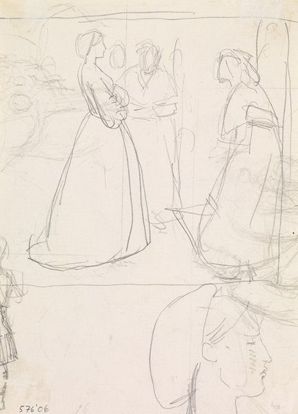 Théophile Alexandre Steinlen sketched "La Saisie" offering us a glimpse into the fin-de-siècle Parisian life. Steinlen, deeply concerned with social issues, positions us amidst a crowd, perhaps during a demonstration or a public event, capturing the atmosphere of urban life. The sketch's focus on women in the foreground invites us to consider their role in the public sphere. Are they participants, observers, or perhaps victims of the societal forces at play? The ambiguity in their expressions and actions allows for multiple interpretations. Steinlen often used his art to depict the struggles and resilience of the working class, and here, he continues this trend by highlighting the presence and perhaps the plight, of women in a rapidly changing society. As we reflect on the sketch, let’s consider how Steinlen uses the urban crowd to reflect the social and political tensions of his time, and to think about the place of women within this context.