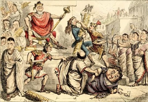 John Leech created this drawing, "Flaminius Restoring Liberty to Greece at the Isthmian Games," using pen and ink, resulting in an animated and exuberant scene filled with intricate details. The composition is dense, with figures packed tightly together, creating a sense of chaotic celebration. The lines are sharp and the hatching defines form and shadow. Leech cleverly uses historical costuming to destabilize conventional notions of representation. The figures are clad in a mix of classical Roman and Greek attire, set against a contemporary backdrop. The drawing’s structure invites us to question how images convey messages, suggesting that meaning is not fixed but negotiated through visual and cultural contexts. Leech's drawing invites ongoing interpretation by highlighting the complexities of visual communication, ensuring that its message remains dynamic and relevant.