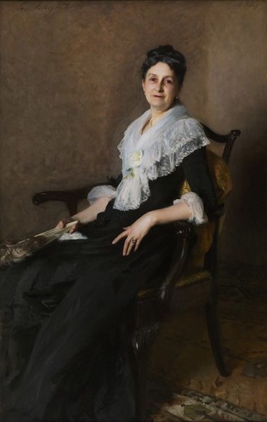 Curator: What strikes me most at first glance is the subdued stillness—almost a watercolor feel but in oils. Editor: Yes, it possesses this ephemeral quality. We're looking at William Merritt Chase's "Girl in White" from around 1890. The portrait is a stunning example of American Impressionism, with its intimate mood. Curator: Right, that's exactly it, an American twist. It is less about light bouncing and a tad more internalized emotion. All the weight lies within the eyes and their heavy shadow, the soft frills acting almost as emotional guards. What kind of archetypes might be conjured for viewers here, or is it purely visual? Editor: I think it calls on a very specific kind of archetypal depiction of women from that era: purity, innocence, perhaps even a vulnerability signaled by the color white, certainly. The pose itself suggests a moment of introspection or quiet resignation—she's caught between display and withdrawn contemplation. What's remarkable is how Chase balances societal expectation with, as you pointed out, genuine emotion. Curator: Balancing the two reminds us of the cultural demands that both imprisoned and exalted. Also, her hands crossed over a kind of gilded cane give it such power as a feminine scepter—an attribute not an accoutrement. The splash of red—such calculated passion—seems not merely an accent, but something symbolic fighting to break out. Editor: Yes! Absolutely; that subtle red flower pinned near her hair disrupts the monochrome scheme—the visual symbol of vibrant inner life fighting to exist within constrained presentation. So for today’s audience what symbols can we read of personal freedoms being found even while outwardly abiding by constraints of gender? Curator: Right! Her ‘stillness’ has that power. The intimacy of “American intimism” is very appealing here because she offers no easy reads, doesn’t yield secrets quickly. Today’s viewer understands being forced to hide what's real and making compromises. Chase somehow captured that eternal battle between private desires and how to fulfill external needs. Editor: Exactly, which makes me think the painting serves as a cultural mirror that shows we are closer to those women from so long ago than many realize—that struggle resonates across decades! Curator: Definitely a dialogue between generations still eager for answers!