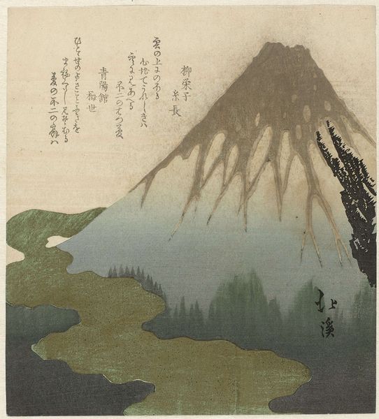 Editor: Here we have "Fuji above the Clouds (variant)" by Totoya Hokkei, sometime between 1890 and 1900. It’s a woodblock print. It feels incredibly serene, almost dreamlike. The mountain, shrouded in mist, looms large. How do you interpret this work? Curator: The serene quality you point out is interesting. Consider ukiyo-e not just as pretty landscapes but as reflections of a society undergoing rapid transformation. The choice to depict Fuji, a symbol of stability, rising above the turbulent clouds, might be read as a visual commentary on the anxieties of the Meiji era. Do you see any tension between tradition and modernity within this apparent tranquility? Editor: I do see it now that you mention it! It’s like the unchanging mountain is observing the changing world beneath. The mist could be obscuring some of the less-pleasant aspects of modernisation. Curator: Precisely. Think about who commissioned and consumed these prints: the rising merchant class. Were they seeking representations of steadfastness or idealised visions of escape from their own socio-political anxieties? The mountain also stands as a symbol of Japanese identity. By visually elevating it in this manner, what cultural messages might Hokkei be sending to his audience? Editor: It's as though he is subtly reinforcing a particular view of Japan, a kind of national pride, perhaps in response to Western influence? I hadn't considered how political landscape prints could be. Curator: Exactly. It’s a negotiation, always, between aesthetics, ideology, and commerce. So, next time, think about what narratives are visually prioritised and whose stories might be obscured. Editor: That's a perspective I will definitely keep in mind going forward. Thank you for sharing your insights. Curator: And thank you for your astute observations; they highlighted interesting facets of this print that I appreciate considering alongside you.