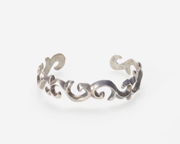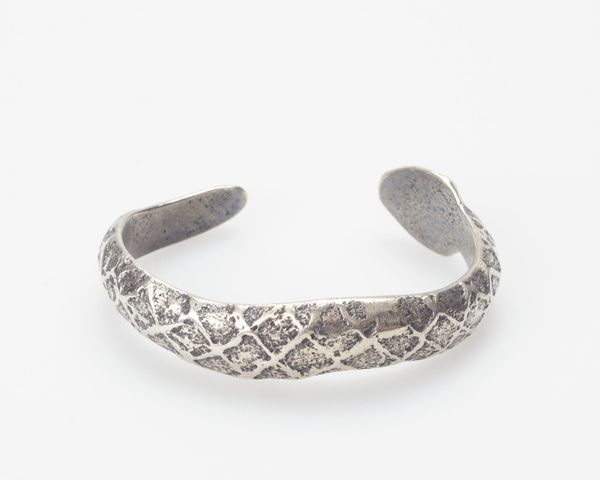 Editor: Here we have a silver bracelet, attributed to the Navajo or Diné people, and dated before 1920. Its simplicity is quite striking; there's something powerful in its restraint. What catches your eye about it? Curator: Immediately, I’m drawn to the raw materiality. Look at the silver itself – its likely source, how it was extracted, traded, and then worked. These early Navajo bracelets reveal a complex negotiation: a repurposing of readily available materials such as silver coins into adornment. Editor: So, the bracelet becomes almost a record of resource exchange? Curator: Exactly. The hand-tooling, too, speaks volumes. The designs pressed into the metal. Who were the workers? Where did they learn their techniques? We often separate "art" from "craft," but objects like this challenge those artificial boundaries. It asks us to reconsider the role of indigenous labor in shaping Southwestern aesthetics. And even consider trade. Were there any requested modifications from consumers of different background than the Navajo/Diné people? Editor: That’s fascinating. It transforms what seems like a simple piece of jewelry into something that represents a much broader story. So the consumption shapes it! Curator: Absolutely. This isn't just adornment; it is material history. Understanding the hands and the economies involved, is crucial. Editor: I see the piece in a completely new light now, thinking about it in terms of material sourcing and labor, rather than just design elements. Thanks. Curator: It shows the intricate connections between making, trading, and the everyday lives of people, shifting our perceptions of value and artmaking itself.
