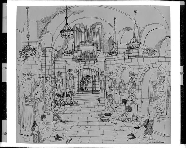 Editor: This is Pablo Picasso's set design for "Pulcinella," created in 1920 using tempera. It depicts the interior of a theatre, with an odd juxtaposition of a formal stage, and an almost dreamlike depiction of a landscape peeking from behind the curtains. What do you see in this piece, in terms of its imagery? Curator: The painting pulsates with duality. Notice how the geometric precision of the theatre architecture contrasts so vividly with the idyllic, almost naive cityscape revealed on the stage? This contrast speaks volumes. Do you notice how the theatergoers are so rigidly positioned in the loges? Editor: Yes, they look like little chess pieces. Almost uniformly attired in black. Curator: Exactly! Now consider Pulcinella himself, a stock character from commedia dell'arte. He represents chaos and disruption. The architectural constraints emphasize a society striving for order. But look, even they long for emotional escape through narrative—the stage on stage alludes to repressed societal desire. The moon in the backdrop suggests something more—longing? Editor: It's like a contained explosion of desires. Curator: Precisely! The architectural setting is rendered almost as a prison for desire and longing. Notice that circular mural painting above, seemingly portraying idealized mythological scenes that remind us that the “real” reality is that of the stage itself! Editor: So the "real" and the represented clash. That is incredible! Curator: These recurring forms function almost like a collective dream, offering glimpses into the shared psyche of a culture grappling with tradition, modernity, and repressed longings. It offers fertile ground for considering cultural memory as a continuum. Editor: Thanks; now I know what questions to consider!