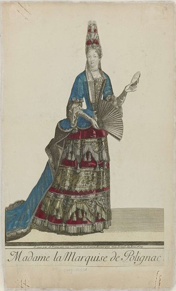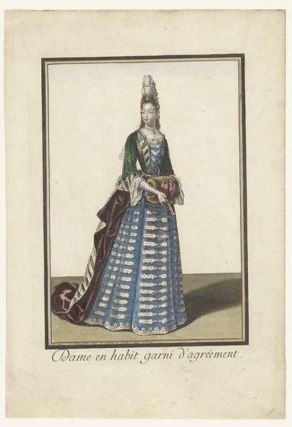 Dieu de Saint Jean created this print, "Femme de qualité en deshabillé d'hyver", sometime in the late 17th century. This image speaks volumes about the rigid social hierarchies and gendered expectations of the era. Here, we see a woman of "quality", emphasizing the importance of social rank during the reign of Louis XIV. Her elaborate hairstyle and layered gown, while described as undress, clearly indicate her elevated status. Consider the layers of artifice and the physical constraints these fashions imposed, reflecting the limited agency women of the aristocracy had at the time. The print offers a glimpse into the rituals of class and gender performance. What does it mean to be a woman of quality? This image invites us to reflect on how identity is constructed through material culture and social expectations. It highlights the ways in which clothing and appearance become potent signifiers of power, privilege, and confinement.