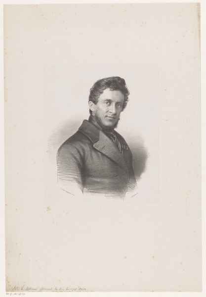 Curator: This is Johann Wilhelm Kaiser's "Portret van Janus Secundus," crafted in 1839, housed here at the Rijksmuseum. It’s a drawing using graphite and pencil on paper. Editor: The softness is the first thing I notice, almost an ethereal quality created by the pencil strokes. The shading gives depth, but it also softens the features, imparting a sense of introspective calm. Curator: Janus Secundus, a celebrated Neo-Latin poet of the 16th century, embodies the Renaissance humanist spirit—the pursuit of knowledge and the celebration of human potential. The choice of pencil perhaps echoes the scholarly nature of the subject, connecting to the act of writing and study. Editor: Indeed, note the strategic composition – the sitter is situated behind a book and holding some type of receptacle or box. These act as planes and grounds within the frame while guiding your eyes towards the main subject. Curator: Exactly, that box in his hand hints at an untold narrative. Janus Secundus died young, which is tragic, so maybe the portrait encapsulates themes of remembrance or contemplation on mortality. The slightly averted gaze could indicate his inner thoughts, dreams, and poetry. Editor: From a technical perspective, consider Kaiser’s expert use of shading to mold the collar and drapery; you could interpret these artistic liberties as the artist making the best of what’s visible. Curator: It’s a delicate dance, balancing realism and idealization within the Romantic framework. By presenting Secundus in a meditative pose, the image resonates with longing and nostalgia—values prized by Romanticism. It reminds viewers of our shared cultural heritage. Editor: It’s compelling to consider how the starkness of the drawing lends itself to an age defined by its obsession with progress—to make a historical figure look more real through subtle artfulness. Curator: The beauty lies in its invitation for the viewer to ponder the past and their relationship with the world through art. Editor: And that dialogue between what we see and what we perceive continues.
