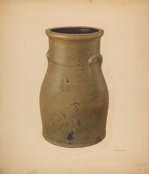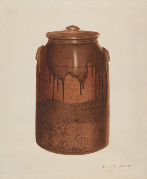 Curator: Welcome. Today we are looking at "Preserve Jar" by Jerome Hoxie, made in 1936. It’s a humble object, rendered in watercolor, likely on paper, showing a ceramic jar. Editor: There's a stillness to it, almost melancholic. The earth tones are very muted and I'm drawn to the slightly uneven coloring. Curator: I’m interested in that exact color. That simple act of preserving food—the canning process, the access, the actual jars, often made locally. Consider the labor, usually gendered female, involved in procuring and preparing food in that era. Was it self-sufficiency, forced scarcity, or just a cultural tradition? Editor: All those aspects you mention resonate. The jar itself suggests sustenance, but also speaks to the cyclical nature of time and domestic labor. What exactly are they "preserving," though? That act has heavy implications considering the economic backdrop of the time. Curator: Precisely! Watercolor offers a very direct and accessible technique—economical both in material and method, mirroring the Depression Era ethos of functionality and making-do. Also, I’m curious as to why the artist painted it, rather than working with clay and making a jar instead of portraying it. Editor: That’s a poignant question. Perhaps it's a quiet comment on societal roles – documenting rather than actively creating? This jar symbolizes an idealized domestic space, while the abstract dark shapes on its surface imply underlying tensions. Is that the "outsider" trying to get in, I wonder? Curator: Interesting parallel! I see now the visual dialogue between a high art medium like watercolor painting and the more quotidian object it represents. Hoxie draws attention to a functional craft and lifts it— through paint—into the realm of art, which itself invites the conversation on access to food, and access to cultural capital, which is as essential as anything edible, right? Editor: Absolutely. It’s an invitation, perhaps, to consider the lives often unseen, to really witness and question the labor that supports the broader community, past and present. The artist gives it due recognition by putting it in paint on paper. I think I initially saw something melancholy in this humble piece because of the silence embedded in all those implications of struggle. Curator: Ultimately, viewing something like this “Preserve Jar” encourages reflection and perhaps an activist stance to recognize the hands that built our own dinner plates and our own culture. Editor: And to understand the depth and implications of simple representation.