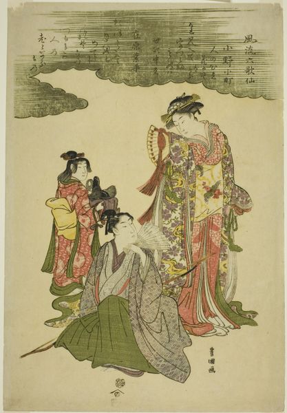 Chōbunsai Eishi, active during the late 18th and early 19th centuries, created "Women Viewing Cherry Blossoms" as a woodblock print, a medium which gained prominence in the Edo period. This was a time when Japanese society was structured rigidly, and these prints offered glimpses into the lives of those within the merchant class and the Yoshiwara district, often portraying women as the central subjects. Here, four women gather, seemingly for a refined hanami, the traditional custom of enjoying the transient beauty of flowers, a moment laden with cultural significance. One offers a lacquered box, another sits elegantly adorned, while one woman beside a basin engages with a miniature boat, perhaps partaking in a sake-drinking game. This moment of leisure is shadowed by the knowledge that such gatherings were exclusive, reflecting the social stratification of the era. Eishi, who was born into a high-ranking samurai family, had an intimate knowledge of class and gender dynamics. The women are depicted with an idealized beauty, yet the scene hints at the complex roles they occupied within their social milieu. This artwork invites us to consider how these intimate moments were both an escape and a reflection of their societal positions.