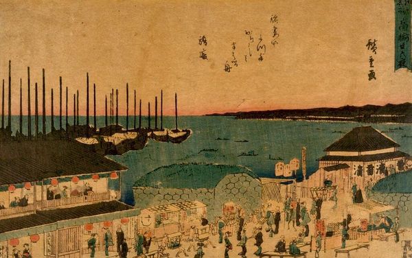 Curator: This is Utagawa Hiroshige II’s “View of Tokyo (Shore with Boats)." It's a woodblock print, a medium deeply embedded in the commercial and artistic life of its time. Editor: It’s so serene, almost melancholic. The muted blues and grays create a quiet atmosphere. Curator: The location is key here. Tokyo, or Edo as it was then known, was rapidly urbanizing. This print offers a glimpse into the city's relationship with its waterways and transportation. Editor: Absolutely, the boats suggest movement, trade, and the lifeblood of the city. And the figures on the shore, seemingly engaged in commerce, are indicators of this dynamism. Are the boats for fishing or transport? Curator: A bit of both, probably. These prints were commodities themselves, shaping how people saw and understood Tokyo. It's a very democratic art form because of how it could be mass-produced. Editor: It’s amazing how such a small work—about 9 by 13 inches—can encapsulate so much history, labor, and social context. Thank you. Curator: Thank you. It really underscores the value of art in understanding our past.
