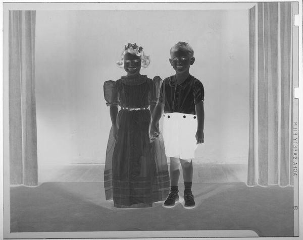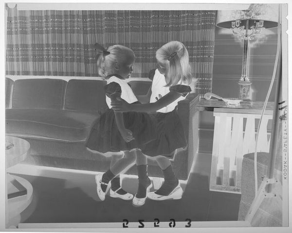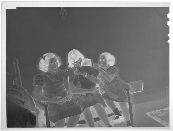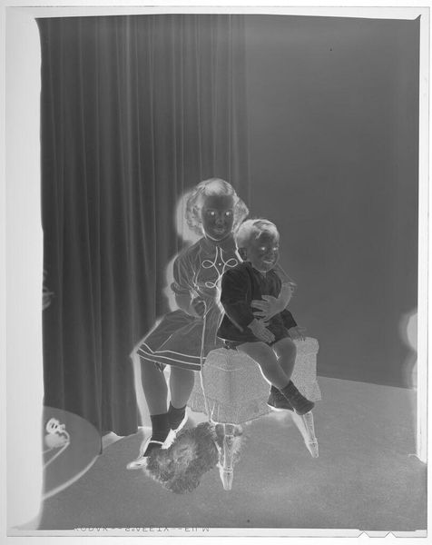 Editor: This is an untitled photograph by Martin Schweig, taken in a living room. The inverted contrast gives it an eerie quality. What do you see when you look at how the children are posed? Curator: The stark inversion compels us to examine the formal elements. The contrast emphasizes the geometric patterns in their clothing and the spherical shapes of the balls, creating a play of light and shadow. Editor: It's interesting how the inversion isolates those shapes. Curator: Indeed. The composition directs our gaze to the interplay between the children and their objects, forcing a consideration of form over content. Notice the vertical lines of the curtains versus the implied movement of the child in mid-air. Editor: I see it now; the stillness of the girl holding the ball is in stark contrast to her active brother! Curator: Precisely. The photograph highlights how form can dictate our interpretation of reality. Editor: It's amazing how much the form changes the feel!