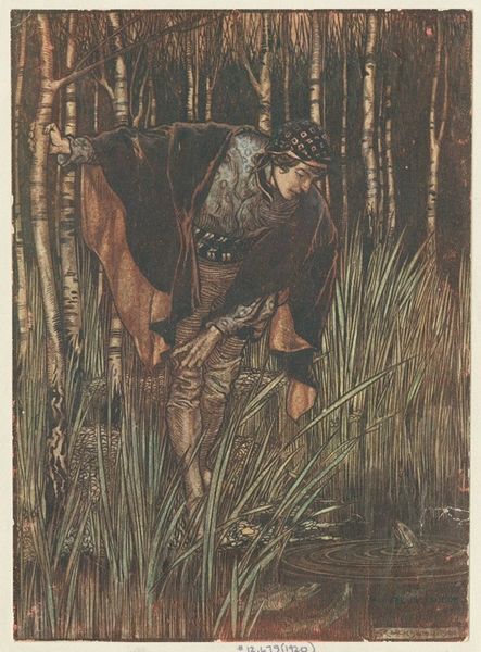 Curator: What a captivating drawing, all delicate lines and brooding atmosphere. Editor: Right? It feels like a whispered secret. There's a definite sense of melancholy about it. Is she going to a funeral? Curator: It's Arthur Rackham's “Brunnhilde slowly and silently leads her horse down the path to the cave”, made around 1910. It's an ink and watercolor illustration for Wagner's Ring Cycle, and embodies a pivotal moment from Norse mythology. Editor: Mythology makes sense – the vibe is spot on. The horse is particularly beautiful, powerful, but with this drooping head. The trees kind of claw in, closing off the composition around the figures. It's not a happy walk. Curator: No, indeed. Rackham frequently explored themes of fate and resignation in his illustrations, particularly within the context of mythological narratives. This piece exemplifies the romantic fascination with the medieval period. The composition echoes a long lineage of dramatic, illustrative depictions. Editor: It's so different from some of the louder, heroic takes you see with Wagner. This has this really strange tenderness to it, despite everything being clearly doom-laden. And I love the little glimmers of color—this orange cloak, those wisps of green on the horizon—amidst all the grayscale. Is that deliberate? Curator: It certainly focuses the attention. Rackham had a masterful way with color, using it strategically to enhance the emotional impact and narrative clarity of his pieces. Also note how his style, deeply rooted in symbolism and art nouveau, provided a visual language ideally suited for interpreting Wagner's world. It allowed him to explore the deeper psychological themes. Editor: So, this is more than just an illustration, it’s a study in quiet emotional complexity. You see this iconic warrior woman, and she’s weary, almost vulnerable. Curator: Absolutely. This drawing engages with a dialogue around heroic representation. Rackham challenges notions of invincibility, presenting the more internal realities of mythological characters, made all the more fascinating given how ubiquitous those heroic narratives are in nationalistic rhetoric in Europe at the time. Editor: Well, now I just feel sad for everyone involved. Makes you want to rewrite the story and give her a happier ending. Curator: Indeed. A beautiful intersection of myth, artistry, and melancholic emotion.