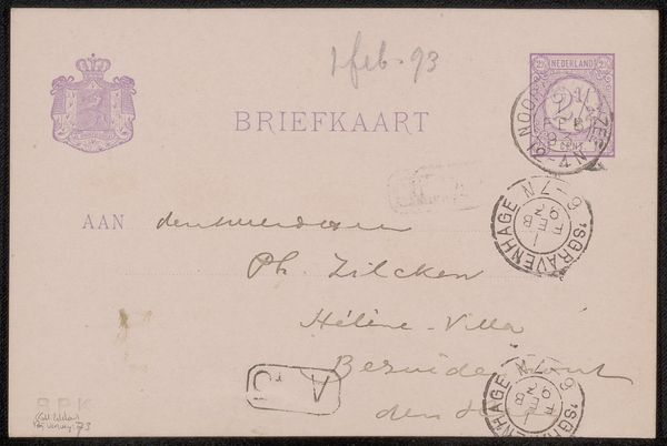 Editor: So, this is "Briefkaart aan Philip Zilcken" from before 1888 by Adriaan Pit, it's ink on paper... It really brings home the idea of a personal, tangible connection across time. The handwriting makes it feel almost intimate, doesn't it? What strikes you when you look at this postcard? Curator: What I find compelling is the role this object played in constructing artistic and social networks. We see Pit, likely an influential figure at the time since it resides at the Rijksmuseum, corresponding with Philip Zilcken, presumably another person of note in the art world. This exchange speaks to the institutional history, doesn't it? These weren't just personal messages, they were reinforcing professional and artistic alliances, and influencing art market. Editor: So, it’s less about the content of the message, and more about its function as a tool for building artistic relationships? Curator: Exactly. Think about how imagery was circulated then. It wasn’t digital, it relied on these physical exchanges. This postcard represents a material trace of those relationships. Even the stamp itself – notice the heraldic imagery. What does it communicate? Editor: It kind of projects power, doesn't it? Authority through the postal service, almost. A statement by the state. Curator: Precisely! The postcard, ostensibly a private communication, becomes embedded in a broader system of state authority and artistic power dynamics. Considering this artwork through the lens of social structures makes us reevaluate not just its artistic meaning but its public role. Does that give you a new way to look at art? Editor: Definitely. It reminds me that art exists not in isolation, but in a constant dialogue with the social and political forces of its time. Thanks, I appreciate this perspective! Curator: My pleasure, understanding these connections enriches our appreciation and informs the ongoing discussion of what art means today.