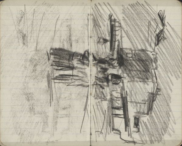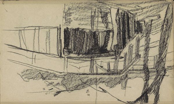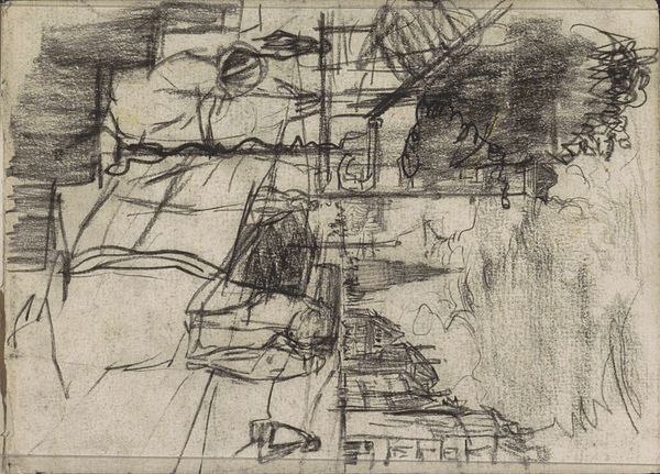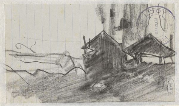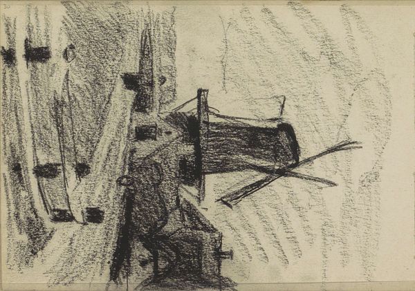 Editor: This graphite and charcoal drawing, titled *Twee figuren bij de molen Rijn en Lek te Wijk bij Duurstede*, by Willem Witsen, dates to 1906-1907 and it’s currently at the Rijksmuseum. The scene appears subdued, with the heavy use of charcoal creating an almost ominous atmosphere. The sketchy style gives it a raw, unfinished feeling. What catches your eye when you look at this piece? Curator: Oh, you know, it's like stumbling upon a forgotten dream, isn't it? All those scratchy, anxious lines... It makes you wonder what Witsen was feeling that day at Wijk bij Duurstede. Did he feel small beneath that imposing windmill? It is very Romantic, don't you think? Those lone figures seem almost swallowed by the landscape and, oh, by the weight of that charcoal. You feel that? Editor: Absolutely. There is definitely a sense of unease there, or perhaps contemplation. Curator: Yes! And have you ever just stopped and listened to a landscape? Not just with your ears, but with your entire being? I think Witsen was trying to capture the *sound* of this place as much as its *sight.* It reminds me of trying to transcribe a melody onto paper... almost impossible, yet the *attempt* is beautiful, in itself. What do you think is more potent: the light, the composition, or his rendering of depth? Editor: The rendering of depth, without a doubt. The layering of the charcoal makes the windmill feel like it’s emerging from the shadows. It really amplifies the feeling of… almost being consumed. Curator: Exactly! See, the genius is in that delicious tension: holding back just enough to hint at what he wants to tell the viewer, like a good poem. These marks – they're the equivalent of whispered secrets. Editor: I see what you mean. The incompleteness almost adds to the emotional impact. Thanks! It’s definitely helped me understand the power of suggestion in art. Curator: My pleasure. Now, if you’ll excuse me, I'm off to whisper secrets to a still life.