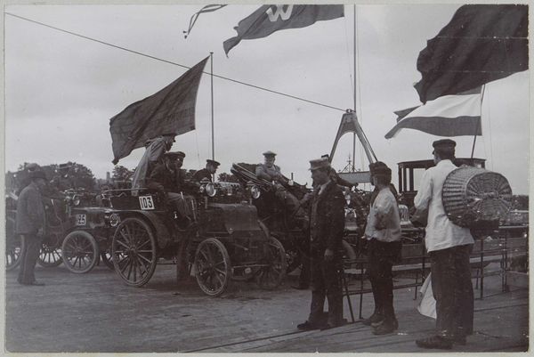 Editor: This photograph, taken in 1898, captures participants in the Paris-Amsterdam race, possibly near Nijmegen. It's a gelatin-silver print held at the Rijksmuseum. It feels incredibly staged, like they’re posing with their new toy, not actually racing. What strikes you most about this piece? Curator: Well, it's a fascinating snapshot of technological optimism and emerging social rituals. Consider the context: automobiles were novelties, expensive status symbols. This image isn't just about the race, it's about the performance of wealth and modernity. Look at the subjects' clothing. How does it inform the relationship between technology and society at the time? Editor: Their clothes are definitely formal! Top hats and jackets… a bit much for a race, right? They look more like they’re off to the opera. Is the act of photographing influencing how they behaved? Curator: Precisely. Photography here is serving a very public role. It's documenting and, more importantly, *legitimizing* this new form of transportation and its wealthy proponents. The automobile, through images like this, becomes part of the accepted social fabric. It signifies progress, linking its owners to a specific socio-economic class. Do you see a sense of speed, or something else being expressed? Editor: Not really speed; they seem rooted in that exact moment. I hadn't thought about it that way, but the photograph definitely elevates the car and the people in it. Curator: Exactly. And notice the crowds in the background – a captivated audience to this spectacle. This photo helped popularize cars and legitimized what they represented. We still see those themes playing out today with our relationships to new technology. Editor: I see your point. This image is as much about selling a dream as it is about documenting a race. Curator: Indeed. It really shows how art reflects and shapes societal values, not just depicts them. Thanks for bringing your insights today! Editor: Thank you! This makes me look at older photographs in a new way.
