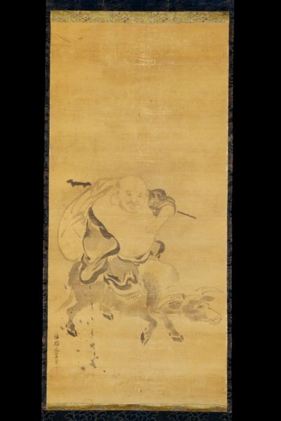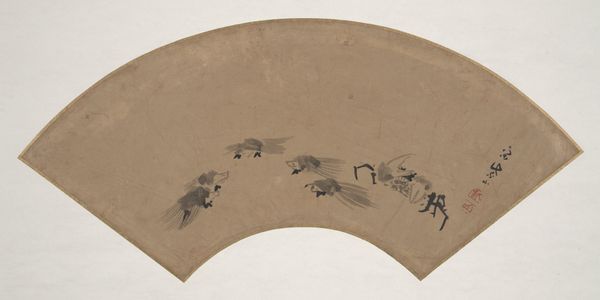 Curator: This delicately rendered piece, "Immortals in Clouds," is an ink and color on silk fan, possibly from the Qing Dynasty. The scene unfolds with elegant figures in what appears to be a heavenly realm. Editor: There's a dreamlike quality to it, almost ethereal. The composition is interesting with the figures placed rather asymmetrically within the circular frame. Curator: The medium, silk, would have been a luxurious material, befitting the status of both the commissioner and perhaps those depicted. Fans like these were not merely functional; they were status symbols, signaling refinement and taste, and were circulated within social strata with specific meanings according to material, design and imagery. Editor: The limited color palette is striking. Browns, greens, and hints of red create a muted, tranquil mood, emphasizing subtle contrast over pure intensity, while the fan construction underscores a sense of ephemeral beauty. Curator: Notice the subtle textures created by the brushwork—how the artist used varying pressure to evoke the flow of clouds and water, thus indicating movement in relation to stasis, revealing artistic control that reflects the time consuming practice needed to establish oneself in elite circles. The scene's perspective, especially the placement of figures on the elevated platforms, offers clues about the cultural context, likely suggesting literati gatherings and refined leisure. Editor: The texture of the silk seems to be very fine; how does that affect the overall impression compared to painting on rougher materials like hemp? Curator: It would allow for finer detail and more subtle gradations of color. Silk was perceived as high quality and smooth, suitable for portraying such an idealized scene as compared to a more earthly presentation based on different materials available during the time. The handle, most likely made of lacquered wood, presents contrasting production value in comparison to the woven material on which the painting is executed, demonstrating value through social symbolism. Editor: That makes sense, the fine texture matches the graceful depiction of the figures, completing the presentation of both painting and implement, offering deeper insight of the value associated within different art and artisanal workshops in the Qing Dynasty. I appreciate seeing it from this angle, considering the processes of both art and craft, their relative importance, and its impact in art history. Curator: Likewise, thinking about the ways labor and material conditions intersected here enriches my view.