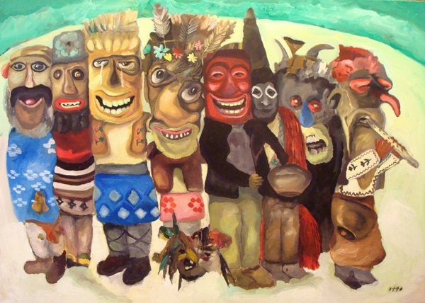 Sue Coe painted "Stuffed Jumbo (fragment)" using oil on canvas, creating a composition that initially appears as a carnival scene, yet it unsettles with its dark tonality and grotesque figures. The painting is structured into two distinct registers: a foreground populated by disfigured clowns and anthropomorphic animals, and a blurred, almost ghostly background scene. Coe masterfully manipulates texture and color to disrupt our expectations. Notice how the foreground figures are rendered with thick, impasto brushstrokes, heightening their disturbing realism. The garish costumes of the clowns are juxtaposed with their somber, almost cadaverous faces, creating a jarring dissonance. The animals, dressed as humans, further destabilize the boundary between the natural and artificial, challenging our perception of order and meaning. The unsettling nature of Coe's piece lies in its refusal to offer a stable narrative, and the formal elements create a sense of unease and challenge our conventional readings of beauty and entertainment.