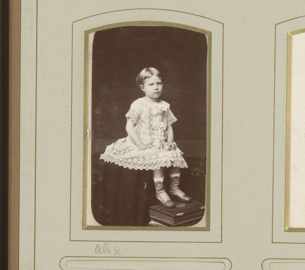 Curator: I am struck by the direct gaze in this photograph; the image is called "Portret van Anna-Lisa Hwasser met een hond" dating from the 1860s to 1870s, by Matheus Hansen. There is something compelling about its simplicity and also Anna-Lisa's stare. What do you think? Editor: My immediate reaction is… unease, almost. There’s a stark formality about it, but that's understandable, given that photographic portraiture was just getting its start. Curator: Indeed. And yet, this is romanticism as it's expressed through photography. Romanticism, in general, offered an opportunity to reflect new social relationships. Matheus Hansen captured more than a likeness; in his work we observe childhood, and we're dealing with class structures that empowered certain families to keep records like these. Editor: It’s interesting to see how quickly visual conventions formed. The arch shape around the image, like a proscenium, feels deliberately crafted to convey respectability, safety, home, a family altar… Even the dog adds to this visual coding; it suggests an idea of faithfulness, especially regarding family connections. Curator: Yes, and think about what it meant for Anna-Lisa to be photographed in the 1860s! She wasn't simply captured; she was positioned within very complex gender and class ideologies. Matheus Hansen actively played into those power dynamics but his artistic choice to capture such a frank and penetrating stare disrupts a passive understanding of this girl. She has opinions. Editor: That’s a compelling point! That seemingly innocent dog carries significant baggage, but the dog also speaks about innocence in relation to Anna-Lisa’s expression: a mix of confidence and unease, especially for a young girl caught in a rigid structure that wasn’t of her making. Curator: There's something so inherently revolutionary about photography in its beginnings – especially within the context of family and women’s shifting identities, which the development of photo technology helped create new access to personal identity creation and family portraiture as the domain for all women—not just the extremely wealthy. Editor: Indeed. The photograph, like an icon, fixes the child and the animal in time and gives the subjects the strength to be more and to express something that cannot be written down and lasts over generations. Curator: And that is one aspect of photography’s particular strength that the artist discovered early in its formation. Thank you. Editor: Thanks; this was enlightening.