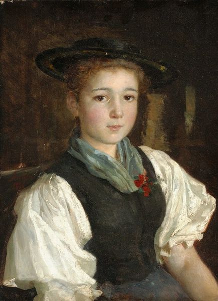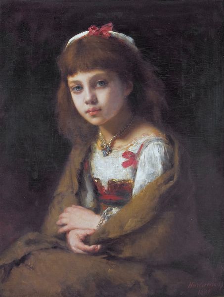 Pierre-Auguste Renoir painted 'Romaine Lacaux' in oil, capturing the essence of his sitter with a delicate grace. The composition centres on the young girl, her figure framed against a muted backdrop of draped fabric and diffused floral patterns. Renoir masterfully plays with light and texture, using soft brushstrokes to render the details of her dress and skin. The contrast between the crisp whites of her blouse and the darker tones of her skirt creates a visual rhythm. The overall effect destabilizes fixed categories by blending formal portraiture with elements of impressionistic spontaneity. Notice how the diffuse background serves not merely as a setting but actively engages with the subject, blurring the distinction between figure and ground. This emphasis on surface and materiality underscores Renoir's exploration of painting as an experience. The artwork invites us to reconsider the nature of representation, to consider how it can challenge established ways of seeing.