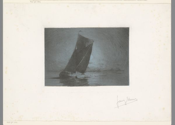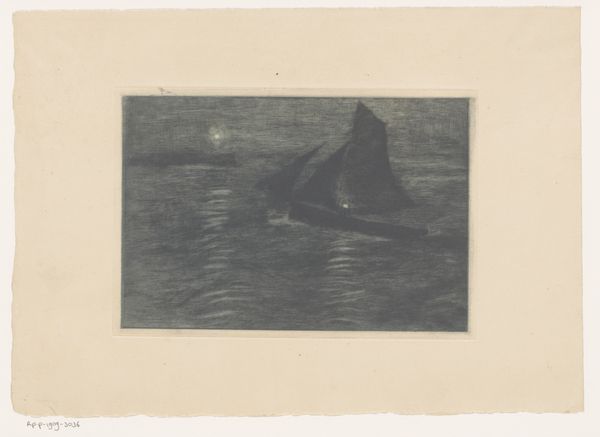 Curator: This Eugène Jansson ink drawing, titled "I Solstrimman," was created in 1900. What are your initial thoughts? Editor: Serene. The monochrome palette lends a tranquil air, and that strong vertical axis, where the sun catches the water, emphasizes depth while also bisecting the image into distinct areas. What story does it tell? Curator: Beyond its surface beauty, it encapsulates Jansson's ongoing exploration of light, particularly as a motif. Sunlight, radiating and powerful, symbolized for many fin-de-siècle artists a certain spiritual essence, often tied to the concept of awakening or transformation. Do you see a parallel there, between the symbolic potential of the light and the rise of the modern aesthetic in Scandinavia? Editor: Definitely. It's also crucial to view this through the lens of the burgeoning political landscapes. Consider Sweden at the turn of the century: Industrialization was ramping up, urban spaces expanding—there’s almost a silent resistance here, an almost melancholic longing for a simpler time reflected in the soft handling of the cityscape in the distance. Is there more significance to the ship here? Curator: Intriguingly, ships, for Jansson, carry strong symbolism, appearing often. A vessel cutting through water can symbolize a journey, but also vulnerability, particularly in contrast to an overwhelming natural force, such as here, the sea meeting a strong sunlight. Its smallness against the light makes one question, "is the human element here resilient, or destined to be consumed by it?". Editor: Right, like the individual against forces much larger than themselves: cultural shifts, industrial expansions. So the visual stillness is loaded with an understated, social anxiety and even resistance to the changes the country was going through, wouldn't you agree? Curator: It is also intriguing how he chooses to work primarily in monochrome to present a natural scene so bursting with luminosity; perhaps it is the reduction of sensory overload which makes the work that much more of an emotive imprint. Editor: Ultimately, Jansson masterfully utilizes light and shadow to render the nuances of not just a seascape, but an inner emotional landscape amidst a rapidly changing world. Curator: An introspective reflection, indeed, revealing how art captures not just a moment in time but an enduring aspect of the human condition.