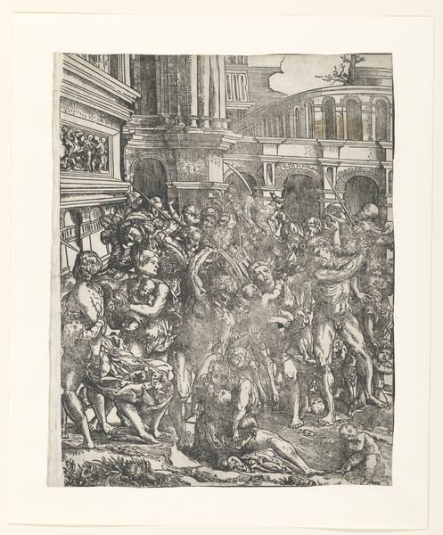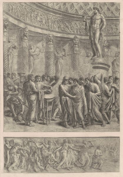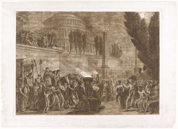 Curator: Just look at the emotional frenzy Ademollo conjures in this print. You feel the raw sorrow and spectacle. Editor: And all that detail captured with etching techniques—the depth he achieves creates a landscape heavy with social narrative. What can you tell me about "The Body of Hadrian Laying in State next to His Mausoleum?" Curator: Created sometime between 1764 and 1849, this piece epitomizes Neoclassical ideals. Though, seeing it rendered in print opens another perspective, don't you think? Consider how prints democratize history and memory. Editor: I find myself immediately drawn to the iconography displayed across the structures—a symbolic language the era’s elite understood implicitly. Think of the Mausoleum itself; the sculpture placed strategically around it; it all broadcasts messages of power and legacy. Curator: Absolutely. The choice to depict Hadrian specifically places this within a narrative of idealized leadership, seen through a distinctly eighteenth-century lens. This image resonates far beyond its immediate subject. The weight of an empire rests on those tiny etched lines, so to speak. Editor: Which prompts an essential question: Whose empire are we *really* commemorating? Is it solely Hadrian's Rome, or perhaps more overtly the echoes of empire reverberating in 18th century European aspirations? The very act of meticulously reproducing and disseminating this image makes it political, doesn't it? Curator: Yes, every revival, every re-envisioning serves present-day needs as much as honoring the past. And so, the layered context behind something like this is why, I suppose, I never tire of art history. It constantly poses fresh questions about who we are, and how symbols continue to shape us. Editor: Indeed. I'll be pondering that layering for some time.