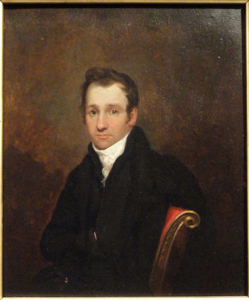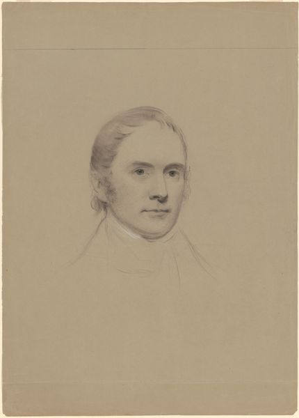 Curator: Before us, we have a painting from the Prior-Hamblin School, simply titled "Husband," created around 1845. It appears to be a rather straightforward portrait. Editor: Striking! There’s something immediately arresting about his gaze. Despite the formal attire, there's an almost unsettling vulnerability in those eyes. Curator: Agreed. Let's examine the formal aspects. Note the flatness, the almost complete absence of shadow, a deliberate choice by the artist. Observe how this reinforces the painting's surface, emphasizing its status as an object, a carefully constructed artifact rather than a mimetic representation of reality. Editor: But can we really divorce this from the socio-political context of mid-19th century America? To consider its significance as purely formal would be to ignore the power dynamics at play. He's posed as the patriarch. Who was this husband? Did he own land, enslaved people perhaps? It’s impossible not to view the artwork as entangled with those power structures. Curator: Your reading presupposes intentions without sufficient proof. Instead, look at the palette: the muted tones, the contrast between the gentleman's dark suit and the warm flesh tones of his face, creating a focal point drawing the viewer's attention precisely there. It speaks volumes about formal balance. Editor: The rosy cheeks and direct gaze might signal something very different when thinking about power structures within marriage at the time. Or are we only invited to reflect on an antiquated patriarchal idea? What does this imagery signal today about representation and complicity? I think we are pushed into analyzing not only an image of its time but also of ours. Curator: An intriguing reading. His clothing is impeccably painted, isn't it? And those buttons and their precise geometric forms interrupt the flatness of the piece as a counterpoint. Editor: Yes. Perhaps in the face of the personal, this form lends a way to control and perhaps mediate complex social roles and their place within history. Curator: A fruitful exchange. It just demonstrates that formalism can sometimes provide a doorway into understanding contextual realities. Editor: I concur. The materiality, of course, invites and informs the context! Thank you for taking this time with me.