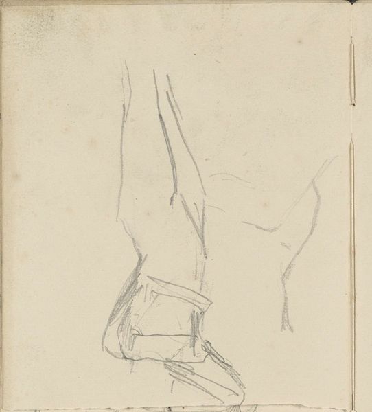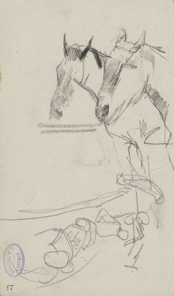 Curator: This drawing, titled "Gezadeld paard, van opzij gezien," or "Saddled Horse, Seen from the Side," was created by Johannes Tavenraat between 1841 and 1853. It resides here at the Rijksmuseum, rendered in pencil on paper. Editor: Hmm, feels like a fleeting moment captured, like a thought half-formed. There’s an undeniable grace, even in its unfinished state. The lines are so light; it's like the horse could just vanish back into the paper. Curator: Precisely! Note the deliberate use of line weight to suggest form. The areas where the pencil strokes are denser give weight to the saddle and the horse’s torso. There's a clear intention behind the execution, prioritizing structure over detailed representation. Editor: I dig that the whole horse isn’t really *there.* It asks my imagination to finish the picture, you know? What breed is it? What's its name? What is it thinking? All the feels are mine to play with. Curator: This speaks to the artistic practice of sketching—an exploration of form and movement intended, perhaps, for later, more formal application. You'll notice there's very little tonal variation, emphasizing outline and contour above all. This gives a flatter, more graphic reading overall. Editor: But isn't there something amazing about that? It has the vulnerability of an artist's sketchbook page. It's not trying to be perfect. There’s beauty in the immediacy, in seeing the artist think on paper. Almost like a poem. Curator: I concur. The work’s aesthetic lies precisely in its directness and apparent simplicity. We see the raw architecture of the horse. Its formal merits become all the more evident when its various structural elements can be appreciated in relative isolation. Editor: Looking at this just now, I kinda wish I knew what Tavenraat was humming to himself while he was drawing it. Curator: An interesting perspective on a concise artwork that successfully isolates the elemental structure and movement of a noble subject. Editor: Yeah, it's like catching a glimpse into the artist's heart. Fleeting, raw, and beautifully unfinished.
