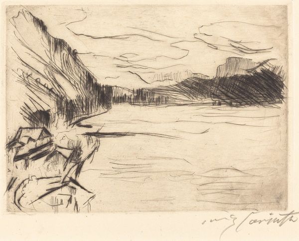 Lovis Corinth created this etching, Am see (On a Lake), capturing a serene waterside scene. Corinth, living through a period of immense social and political change in Germany, navigated his identity as an artist in a rapidly modernizing world. As a man working within a traditionally male-dominated art world, Corinth often depicted subjects through a lens that emphasized masculine viewpoints and experiences. However, in this tranquil landscape, we see a departure from traditional representations of power and gender. The delicate lines and soft tones evoke a sense of quiet contemplation and harmony. The artwork invites us to reflect on our relationship with the natural world, and perhaps consider our own places within the broader social landscape. It's a reminder of the simple beauty that exists outside the confines of societal expectations, offering a space for introspection and emotional connection.