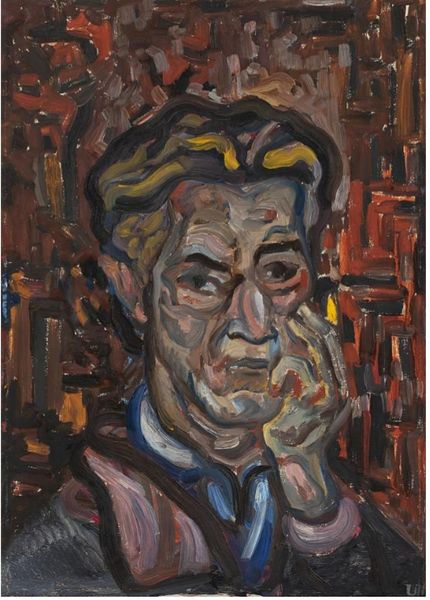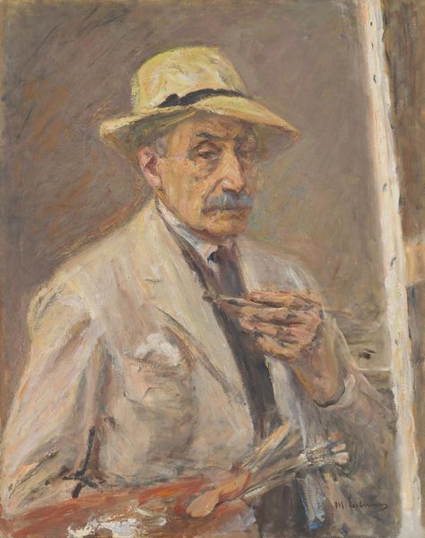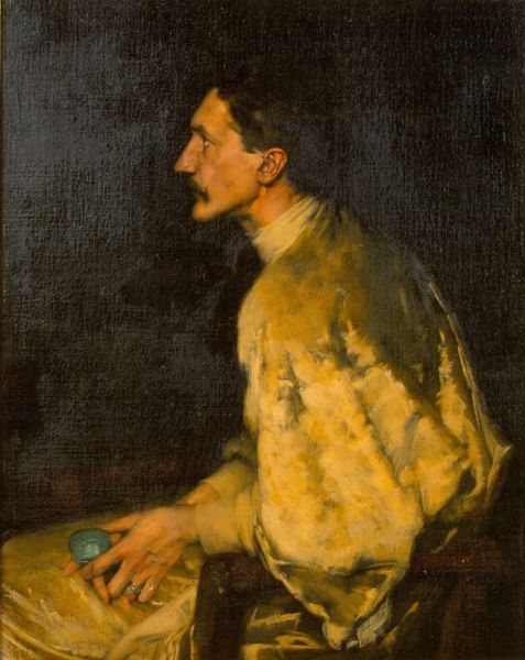 Editor: Here we have Merton Clivette’s *Self-Portrait*, located at the Harvard Art Museums. The thick brushstrokes give it an almost sculptural quality. What strikes you about the formal elements of this piece? Curator: The bravura of the brushwork is indeed compelling. Note how Clivette uses impasto to create texture and volume, particularly in the face. The juxtaposition of light and shadow, achieved through tonal variations, defines the contours. Editor: It’s interesting how the dark background makes the face almost emerge from the shadows. Curator: Precisely. Consider the composition as a study in contrasts—the dark and light, the rough texture against the smoother areas. It creates a dynamic visual tension. Editor: I hadn’t considered it that way before. Thanks for helping me see it in a new light.