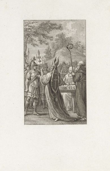 Editor: So this etching, "Theodorus on a Donkey Surrounded by Bishops and Monks," made in 1804 by Reinier Vinkeles, has such a detailed, historical feel. The composition looks…odd. What do you make of it? Curator: This image teems with encoded meanings. The choice of a donkey, for instance, isn't accidental. Donkeys often symbolize humility, perhaps even a conscious rejection of worldly pride for Theodorus. Yet, consider the historical context - what would riding a donkey *mean* to an audience familiar with biblical stories of Christ's entry into Jerusalem? Editor: A parallel, maybe? A deliberate echo of something grander? Curator: Precisely. And note how Vinkeles surrounds Theodorus with clergymen, yet emphasizes the encounter with a single monk on foot. The transfer of something – perhaps a document or relic – taking place? This could represent a specific moment of succession or delegation of power, steeped in symbolic importance within the religious order. What emotions do *you* gather from this scene? Editor: Well, I see respect, definitely a ritual. The way everyone is arranged gives it a formal, staged vibe, but there’s something also very earthy about that donkey... it is quite the juxtaposition. Curator: Yes, a brilliant discordance. Earthy humility elevated into solemn ritual. Consider how the artist weaves together these threads: the sacred space indicated by the gothic architecture in the background with a man of power riding a donkey! Now *that's* a visual metaphor! What’s your final reflection about it? Editor: I definitely didn’t expect so much meaning to be embedded in just one image. Seeing it just as a historical record would have been selling it short. Curator: Absolutely. Visual symbols are powerful cultural echoes. We interpret them, we reinterpret them, and, in doing so, perpetuate their significance across time.