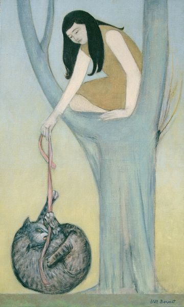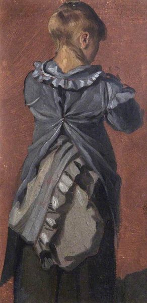 Editor: Alfred Stevens’ *Le Coup De Vent,* painted in 1891, portrays a woman by the sea. The muted colors create such a somber atmosphere, and the composition feels almost precarious. What formal elements stand out to you? Curator: The dynamism created through diagonal lines. The thrust of the woman’s figure, countered by the implied line of the shore and sea, lends to a powerful asymmetry. Note the textural contrast: the fluidity of the ocean versus the defined lines of the woman’s attire. The colour palette, limited in its range, reinforces this interplay of turbulence and restraint, of the picturesque with a somber naturalism. How does the relationship of the figure to the environment inform our interpretation? Editor: That’s a good question! It strikes me how small she is within the landscape. Is she perhaps facing some existential challenge? The umbrella almost mimics the stormy skies above. Curator: Semiotically, the umbrella and the dog are visual aids. However, I am inclined to consider the structural tension established via light, its subtle tonal gradations. A focal point here lies in the juxtaposition of light and shadow on the dress, the interplay signifying the fluctuating psychological state of the depicted. I wonder, do you view the loose brushwork as reflecting psychological or environmental chaos, or a bit of both? Editor: It seems to reflect both inner turmoil and the tempestuous weather simultaneously! Thank you for highlighting the formal techniques and theoretical perspectives that enriched the aesthetic discourse around the artwork. Curator: Indeed, recognizing these aspects amplifies the multilayered dialogues that an image encourages.