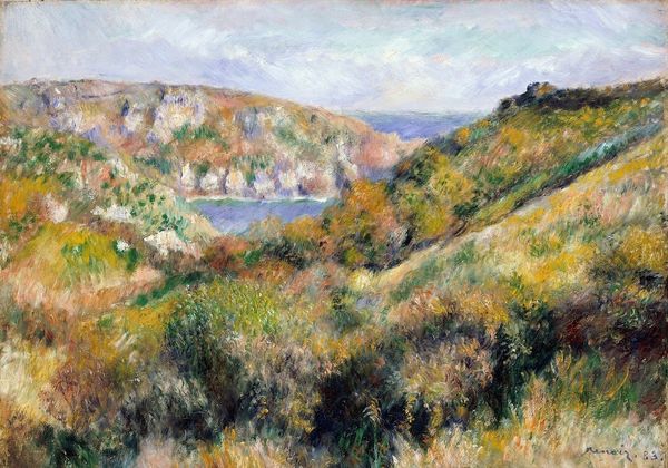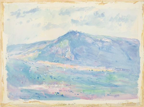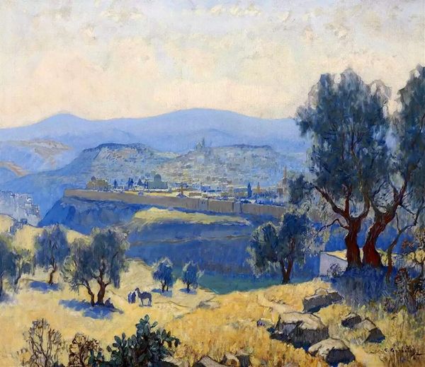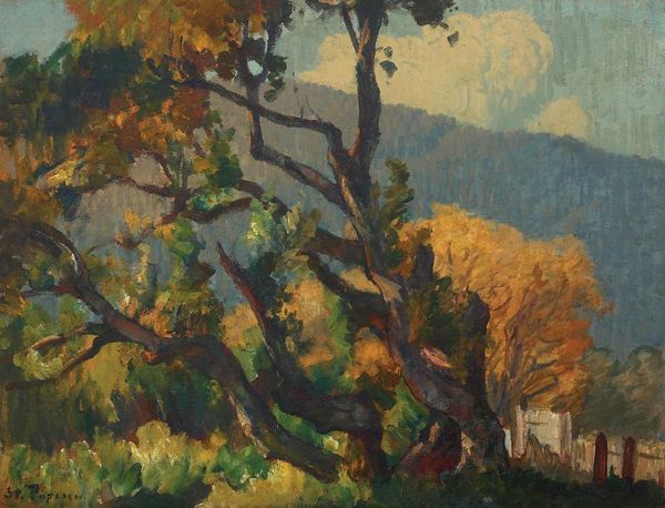 Editor: Samuel Mutzner's "Springtime in Balcic," painted in 1934, is such a charming oil painting. The soft hues create such a peaceful and romantic ambiance, like a faded memory. What formal elements strike you most in this work? Curator: The painting demonstrates a delicate interplay of color and form, aligning it with post-Impressionist principles. The composition favors an atmospheric perspective, achieved through subtle shifts in color temperature and value. Notice how Mutzner uses juxtaposing hues— the pale blues of the water against the pink blossoms — to create depth. What about the brushwork? Editor: I see the loose, gestural brushstrokes; they almost dissolve the forms into light. It’s as if the scene is shimmering, especially the trees, they really pop out from the other muted colours in the work. Curator: Precisely. That application aligns the work with the aesthetic values inherent in plein-air painting. It prioritized capturing ephemeral atmospheric conditions directly from nature. It becomes more about the perception and materiality than representing any subject with photorealistic exactness. Consider the contrast of textures, where the granular paint evokes both foliage and structure simultaneously, flattening any pictorial illusionism. Editor: I see, the visible brushstrokes act almost like building blocks, making us aware of the painted surface. So it's less about creating a believable landscape, and more about the properties of the paint itself, and the choices he made. Curator: Precisely. Editor: This new appreciation really heightens how Mutzner’s style conveys fleeting moments! Thank you for drawing my attention to that! Curator: Indeed. The painting functions less as a window onto a scene, and more as a complex object manifesting an optical and tactile experience.