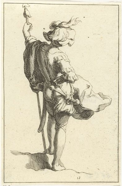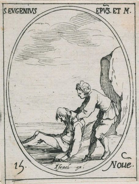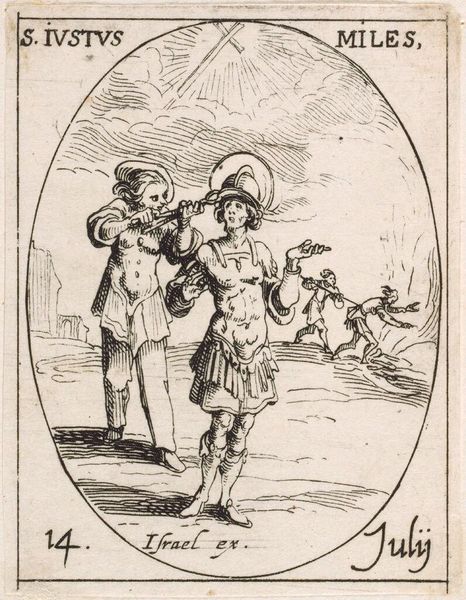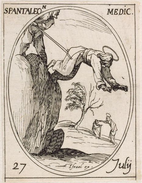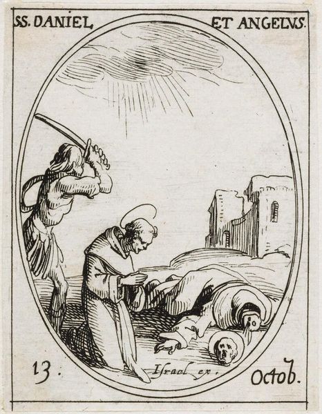 Curator: Here we have Jacques Callot's miniature etching, "Saint Dula." It's a remarkably detailed work given its diminutive size, only 7.6 by 4.9 centimeters. Editor: My first impression is stark horror; the scene is immediately unsettling, depicting violence with such graphic precision, even on this tiny scale. Curator: Callot’s masterful use of line creates incredible depth. Note how the composition directs our eye from the foreground figures toward the distant, receding landscape. Editor: Yes, but that landscape, those receding forms, seem to almost celebrate the execution. It's a brutal commentary on power, silencing dissenting voices, especially female ones. Curator: The controlled hatching technique, characteristic of Callot, lends a sense of drama to this tragic scene, doesn't it? Editor: Indeed, it highlights the vulnerability of Saint Dula against the oppressor's dominating stance. The artwork becomes a reminder of historical and ongoing struggles for bodily autonomy. Curator: A concise lesson in composition and technique. Editor: And a potent reminder of the power dynamics art can reflect and challenge.