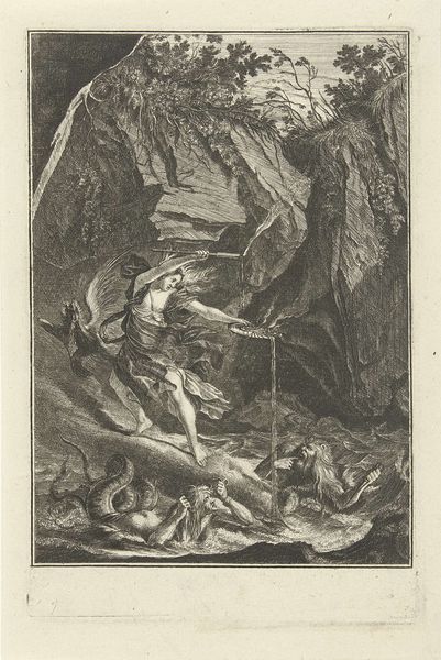 Editor: This is “Fable III, plate three from Lehrreiche Fabeln aus dem Reiche der Theire” by Johann Elias Ridinger, made in 1743. It's an etching, so a print on paper, and it depicts animals in a forest setting. It's quite intricate, and something about it feels a bit ominous to me. What do you see in this piece? Curator: Ominous, you say? Yes, I get that. Think about fables – they're not always sunshine and rainbows. This piece, being from a series of "instructive fables," likely carries a moral weight. Ridinger, bless his baroque heart, wasn't just doodling cute critters. He was speaking to human foibles through animal allegories. Notice how crammed the animals are, struggling in what I'd describe as an emotional turmoil. Does anything jump out about the relationship of these different animal characters? Editor: The owl looks… wise, maybe? Perched above the fray, while the other animals, like the wolf and… are those cats? Are fighting below? It looks as if he might have a bird in his claws too. Curator: Precisely! The owl observes, perhaps judges, or even manipulates the conflict. The scene suggests treachery, maybe veiled threats within the animal kingdom – or, metaphorically, within society. The style reminds me how power dynamics and moral lessons were communicated at the time. Remember, the Baroque loved drama and complexity. So, the crowded composition mirrors the tangled relationships and obscured intentions that Ridinger wanted to explore. What do you make of the text below? Editor: Oh! "A pretended friend is more harmful than an open enemy." Wow. That changes everything. The owl... he's the false friend? Curator: Precisely! Now we see Ridinger has cast the owl. What begins as unsettling turns into treachery cast with absolute definition! The work feels incredibly dynamic, emotionally more charged now. The image has really evolved with language, for me at least. Editor: This piece felt heavy before, but now understanding the moral makes it more profound and complex. It makes the history really jump out!