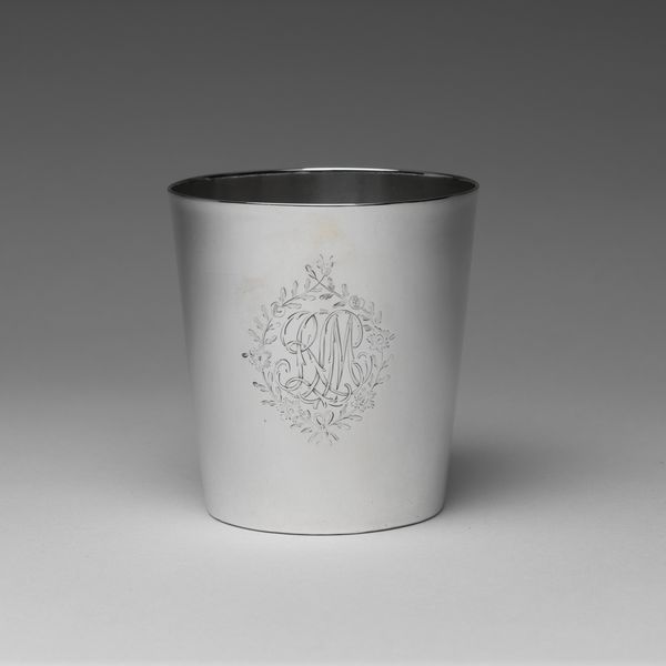 Curator: Here we have a silver beaker, created around 1805. It resides now in the collection of the Metropolitan Museum of Art. What do you make of it? Editor: Well, it's rather unassuming at first glance, isn't it? Smooth, silvery sheen... clean lines. Gives me a feeling of quiet dignity, almost starkness. But there's that delicate etching... breaks up the austerity. Curator: The beaker, attributed to Benjamin Halsted, speaks to the emerging merchant class of early 19th-century America. Silverware wasn't just functional; it was a statement of social standing. Editor: A statement indeed! This one's whispers rather than shouts, though. See how the monogram and that...is it a griffin?... are so subtly integrated? Almost a secret language. Imagine the stories it could tell of toasts and intimate gatherings. Curator: Exactly! The griffin, a symbol of vigilance and courage, was likely part of the owner's family crest. Beakers like this were often presented as gifts or commemorative objects, cementing social bonds and celebrating milestones. Silver objects were quite popular since families and clans usually had unique family crests which were flaunted throughout their precious belongings to declare kinship and their standing within the society of the era. Editor: Makes you wonder about the hands that held it, doesn’t it? What were their lives like? Were they aware of the weighty symbolism embedded in their drinking vessel? Did the owner appreciate its maker's care to keep the design refined despite of the silver which, by itself, stood for richness. Curator: We can assume so! Silver in that time was a commodity more than art and thus was used by those seeking a sign of status in their social lives. These artifacts allow us to reflect on shifts in our values around the concepts of identity, prestige and power. Editor: Absolutely! And on the delicate dance between artistry and utility. The beaker has seen it all – the slow reveal of dawn's sunlight, or the hushed shadows of twilight. What could one add to that sentiment! Curator: It's these subtle clues embedded in seemingly simple objects that transport us back in time. They illuminate the intricacies of everyday life. Editor: It is indeed. It brings so much to one's thought beyond just its appearance; A silent poem waiting to be read!