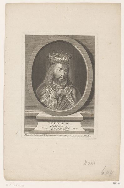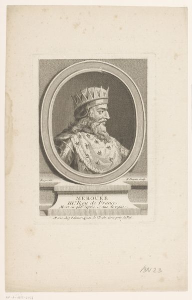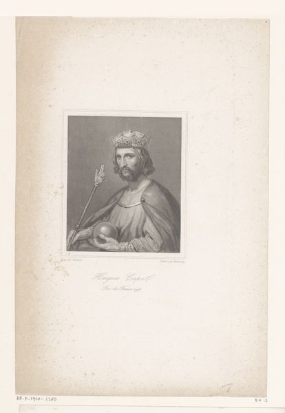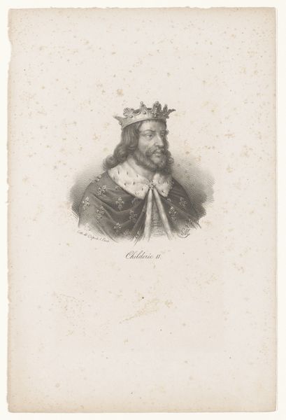 Curator: A compelling portrait! This engraving from 1829-1898 by Auguste Thomas Marie Blanchard depicts Chlotharius III, a king from the Frankish Merovingian dynasty. Editor: My first impression is one of slightly melancholic authority. The pale tonality gives the subject a removed and ethereal quality, as if he’s a ghost of rulers past. Curator: Blanchard's choice of the engraving medium invites us to consider the layered symbolic weight. As a print, this image carries echoes of dissemination, a desire to convey something beyond the singular likeness of a man. Editor: Indeed. I think we need to consider who chose to portray Chlotharius centuries after his death. Was it purely an antiquarian interest, or a statement about power in the 19th century itself? Blanchard's artistry isn't just reflecting the past, it's participating in the ever-shifting present. Curator: The regal objects themselves—the crown and the scepter—serve as symbolic embodiments of divine right and inherited power. They act as potent signifiers within a system of cultural understanding, shaping how power is perceived. Editor: Right. The crown isn’t just decorative. It represents an inherited role, but perhaps one increasingly challenged at the time this print was made. Royal portraiture always negotiates this tension. Even in seeming veneration, there may be a quiet subversion, an invitation to question. How complicit is Blanchard in upholding a vision of static authority versus questioning the established order? Curator: That’s a compelling point. One also might ponder the meaning of such artifacts and their symbolism across time—how it transcends periods and reigns to embody core themes about authority and influence. Editor: Exactly, and bringing that interpretation forward helps us to dissect lingering vestiges of these symbols of power even now. It’s a useful thing to investigate how certain themes refuse to vanish from view. Curator: A stimulating discussion, thank you. It sheds light on the depth beneath what some might mistake as simply a conventional historical print. Editor: Agreed. I’m reminded that art always participates in conversations far beyond its immediate subject. I hope listeners explore similar throughlines when encountering work in this exhibit.