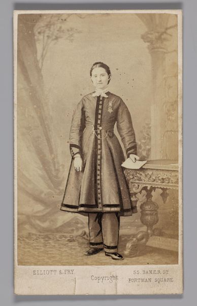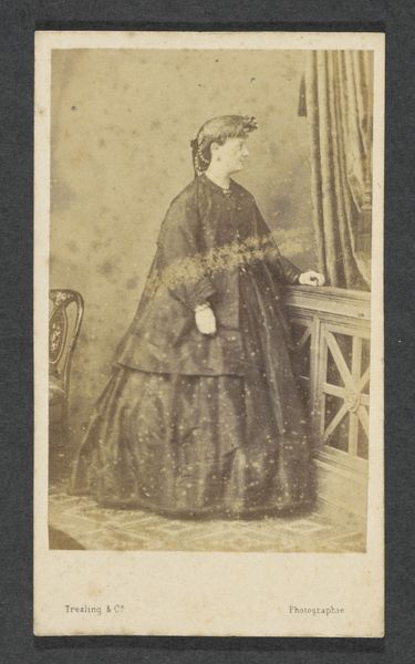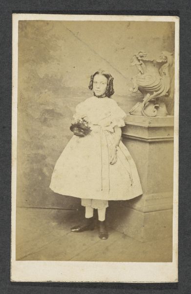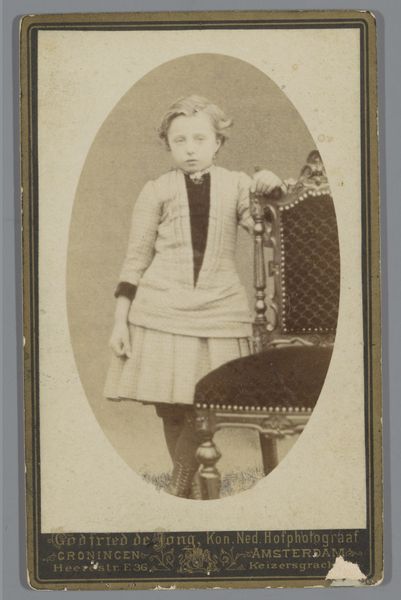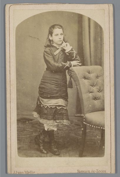 Curator: Today we're looking at "Portret van Cornelia Hendrika Jonker," a gelatin-silver print from somewhere between 1874 and 1887, created by Albert Greiner. It's part of the Rijksmuseum collection. Editor: Oh, there's a serious formality to it, isn’t there? The muted tones, the calculated pose...almost like a stage set where life plays out. Curator: Precisely. Observe how the artist orchestrates light and shadow to emphasize the sitter’s social position. The textured backdrop, though artificial, speaks to wealth and taste. And that dress—note the rigorous, almost mathematical, arrangement of the stripes. Editor: The dress seems...almost severe for a young girl, but somehow endearingly eccentric. And what about the set? An ornate desk crowded right there by her. Curator: The photograph is definitely composed to convey notions of propriety and order through geometry. Think of structuralism. Greiner has very consciously controlled how meaning is produced by these different elements in the photograph's "language". Editor: I'd love to know her thoughts. This girl seems almost overwhelmed by it all. Curator: An interesting contrast, wouldn’t you agree? Cornelia's youth and nascent subjectivity contrasted against this highly stylized, artificial construction that, for that time, had quite serious, formalized objectives. Editor: Definitely gives you a whole new layer of respect for these old studio shots. I get so caught up thinking it’s just a simple photo and forget they had specific agendas to communicate with how things are shot. I get that push and pull now with the artifice! Curator: That interplay, between individual expression and the societal constructs defining it, remains fascinating to dissect even now. The visual construction carries weight, shaping how Cornelia, the person, is perceived. Editor: Now, looking closer I am more drawn into its silent story; more sensitive to how personal and how culturally fixed, her expression is in her time and space. Curator: Indeed, that intersection is rich territory. It gives rise to narratives far more intricate than initially meet the eye.