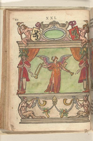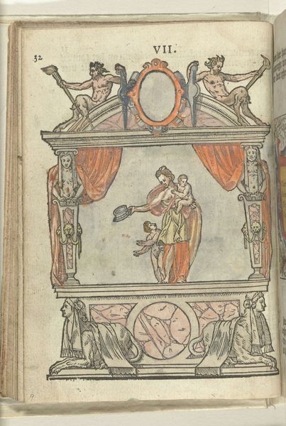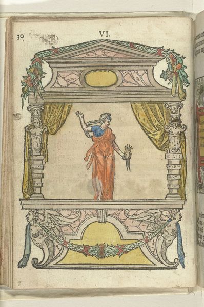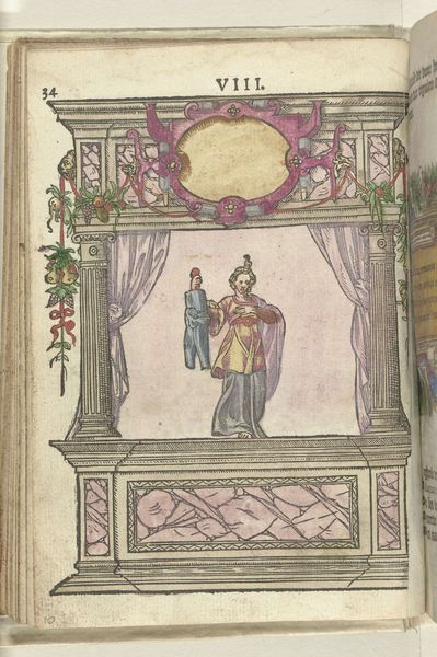 Editor: Here we have "Toneel met personificatie van de Voorzichtigheid (Prudentia)", created around 1578 by Antoni van Leest. It's an ink, colored pencil, and drawing on paper. It's part of what seems to be a bound book. What really strikes me is the elaborate stage-like construction. How would you interpret this piece? Curator: Well, considering the materials, we see a distinct process of layered application. The initial ink drawing likely provided the structural framework, and then the coloured pencil was meticulously applied to define form and texture. Given that it is bound in a book and the printing technology of the era, what implications does this have for the wider distribution and reception of these allegorical figures beyond elite circles? Editor: That's a good point about accessibility. It makes you wonder about the social context of producing illustrations. I also noticed what looks like hasty coloring -- there are spots outside the lines. Was this hurried work, or is that simply what illustrations often look like back then? Curator: It speaks volumes about workshop practices, doesn’t it? This might imply division of labor, with perhaps less experienced hands filling in colors. The focus might have been less on immaculate perfection, and more on volume and efficient production, especially if this was destined for a widely distributed publication. Note, too, how the allegorical content emphasizes virtue. Is it meant for mass consumption, teaching morals to tradespeople and artisans, or for elite distribution amongst scholarly audiences? Editor: That's fascinating! Considering the social status of this book illustration is relevant to thinking through what it really means. Thanks so much! Curator: Absolutely. Examining the tangible production gives us direct insights into the complex interplay of art, labor, and its intended audience during the late Renaissance.