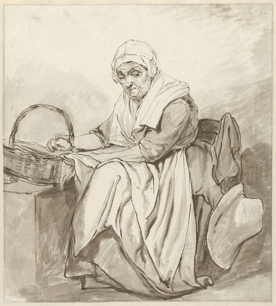 Curator: Welcome. Before us, we have Pieter de Mare’s engraving, "Koekenbakster," likely created between 1768 and 1796. Editor: It has a melancholic air to it. The aging woman's posture, the low horizon line, and the muted palette evoke a sense of solitude. What can you tell me about the materiality? Curator: This print provides a glimpse into the world of artisan labor. We see the tools of her trade: pots, pans, implements for cooking over an open fire. De Mare captures the physical realities of a cook’s work, possibly rendering it more romantic in doing so. Consider also the socio-economic context—this wasn't "high art" subject matter, but a recording of daily existence. Editor: Absolutely. And beyond just recording, there’s symbolism in this domestic scene. The fire represents transformation, warmth, but also the fleeting nature of life itself, feeding into the figure’s pensive attitude. She is working, making food for nourishment, she's essential, a link to family and social ties. Curator: Precisely. The etching, made via engraving, reveals much. Here's an artisan memorializing another. Look closely, and we appreciate the engraver's labour and skill, as they reproduced the material reality of Koekenbakster’s. This process mirrors her own. There's a social connection. Editor: What strikes me are the circular forms—the pots, her face within the bonnet—suggesting repetition, a cyclical existence. The scene seems suspended in time, almost iconic in how it presents the idea of simple life. It highlights a theme: labor with dignity. Curator: I agree; labor *and* dignity—two concepts sometimes presented as opposites in this era. De Mare's selection of a genre painting also carries symbolic weight. What we eat, how it is made and by whom are all core parts of society's underpinnings. Editor: Well said. By diving into materials and symbols, we've uncovered more layers than I initially saw. It offers a compelling look into not only past processes but our enduring relationship with them.