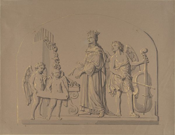 This anonymous line drawing presents the classical figures of Hermes and Athena, possibly as a study for a ceramic work. The cultural significance of the work resides in its visualization of Greek mythology, which was a bedrock of ancient society. The imagery creates meaning through the established visual codes: Athena's helmet, spear, and shield mark her role as a goddess of war, wisdom, and crafts. The owl, perched on her finger, is another of her established attributes. Hermes, messenger of the gods, is shown with his traditional staff, seated in a relaxed pose that emphasizes his more casual role. The style of the drawing and the medium suggests that the artwork may have been created in Europe during the Neoclassical period. The wave pattern around the circular frame reminds us of the significance of maritime power in the Greek world. Understanding the social conditions that shape this kind of artistic production involves delving into the art market of the period, as well as the institutions of art education and artistic patronage. The drawing’s value is contingent on the viewer's awareness of Greek mythology. The historical context informs our interpretation.