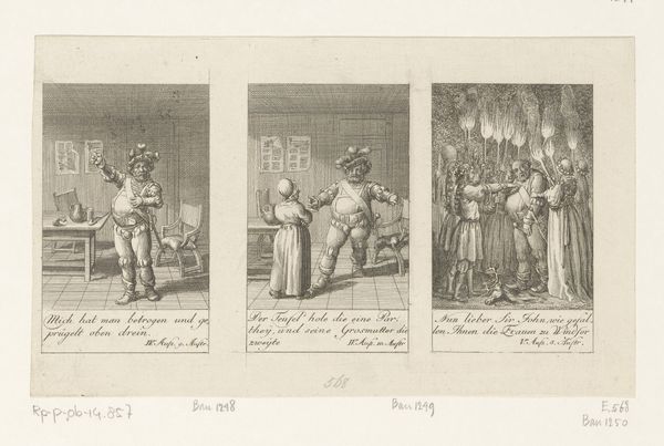 Daniel Nikolaus Chodowiecki created this print, "Percy en Lady Percy in gesprek," using etching. The scene is dominated by two figures adorned with elaborate headwear with feathers. The figures gesture towards each other amidst the soft glow of candlelight. These gestures, repeated through the ages, echo across time. Consider the hand gestures in classical oratory, aiming to persuade and captivate. These are not merely movements, but rather vessels of intent. Observe, too, how candlelight appears in countless paintings, each flame a beacon of domesticity, or hidden knowledge. Light emerges as a symbol of illumination, both literal and metaphorical. The subtle interplay between light and shadow invites us to explore the psychological depths of the scene. It evokes a sense of intimacy and introspection, a stage for unspoken thoughts and emotions. These images are not relics of the past, but rather threads in a rich tapestry, continuously rewoven by human hands and minds.