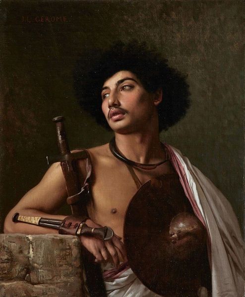 Editor: Valentine Cameron Prinsep’s "Ayesha" features a young woman holding a large copper vessel. The contrast between the cool metal and the warm orange shawl is quite striking. What elements of the composition stand out to you? Curator: The interplay between the textures is compelling. Note how Prinsep juxtaposes the smoothness of the copper against the drapery's folds, enhanced by the light. Observe the formal contrast between the circular form of the vessel and the rectangular backdrop. Editor: That's a great point about the textures! Curator: And what about the arrangement of colour and line – how would you describe it? Editor: The warm shawl and copper vessel really pop against the darker background. It makes the subject the clear focal point. Curator: Indeed. The artist manipulates these formal elements to construct a balanced, visually engaging work. Editor: I see the painting in a new light now. Thanks for pointing that out! Curator: My pleasure. These elements are crucial to our understanding.