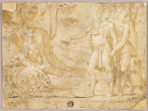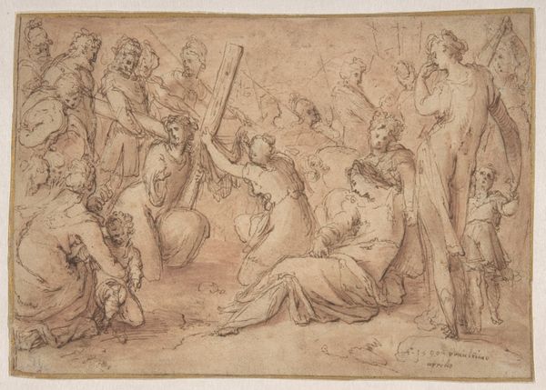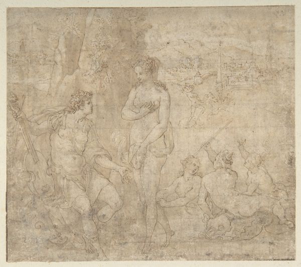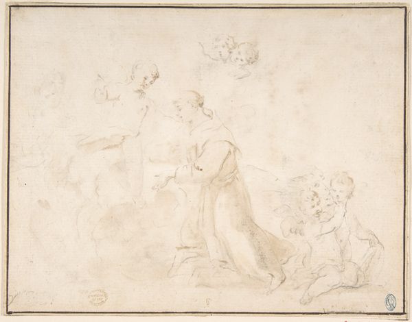 Curator: This sanguine drawing, done by Francesco Allegrini between 1624 and 1663, is called "Group of Standing and Seated Female Figures (recto); Costumed Female Figure (verso)." Editor: There's something immediately appealing in its lightness. Like figures glimpsed through a mist, sketched memories. The red chalk feels delicate. Curator: Delicate indeed! Sanguine chalk was perfect for rendering flesh tones, adding that breath of life to sketches. Look at how Allegrini layers the strokes. It’s a workshop sketch—you can practically hear the rustle of costumes! He’s exploring arrangements. Editor: The arrangement speaks volumes, especially the seated figures clustered around the standing one. Is it just me, or does it echo ideas of social rank or power structures embedded within Renaissance society? How accessible were these materials, what stories do they tell of labor within his workshop? Curator: Good question! Access to drawing materials and how an artist used them were absolutely part of social meaning, class divisions... But to me, this study exudes something spiritual as well, as Allegrini played with composition for larger narrative painting commissions, potentially religious. What does the labor of creativity *feel* like, at the start of a process? Editor: Well, these aren’t idealized figures; you see his process. He's not afraid to show how making the sketch becomes this sort of labor-- that makes it powerful and challenges the notions of "high art" in Renaissance art that relied on expensive materials, precise execution, and so-called "flawless" representation. Curator: Beautifully said. But beyond technique, do you not get the sense of reverence here? Maybe these sketches hint at Allegrini’s devotion as he was planning out paintings for some church commission. Look how the red ink evokes warm feelings and almost spiritual feelings. Editor: Maybe...or maybe that's how we've been taught to *feel*! It could all come back to how this raw, seemingly insignificant drawing was later deemed worthy by collectors. The way value is assigned shifts our perceptions even now. Curator: Right you are...a good reminder that materials and artistic interpretation are both lenses! Editor: Agreed. A sketch holds history, even without trying to, in every mark, in every revision, and ultimately changes art history through process.
