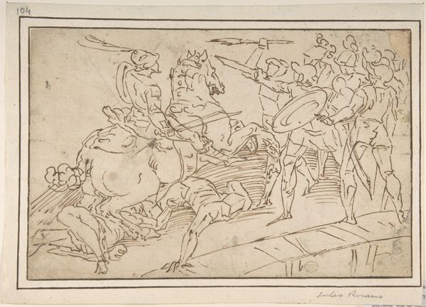 Editor: Here we have "An Antique Naval Battle," an engraving dating from the 1540s or 50s currently housed at the Rijksmuseum. It’s packed with detail, a swirling mass of figures on a very ornate boat. What jumps out at you? Curator: The boat itself reads like a compendium of classical symbolism. We have these almost grotesque masks and garlands intertwined, suggesting the cyclical nature of triumph and tragedy. It also embodies an intensely competitive spirit. Do you see how these aren’t just oarsmen, but powerful, almost struggling figures? Editor: Yes! There's real tension in their poses. And is that a ram's head at the front? What might that symbolize? Curator: Exactly! The ram is, of course, an ancient symbol of virility and aggression. So we can interpret it both in terms of individual and state-sponsored ambition, a period of ruthless clashes and desire for prestige. But notice the putti also… Editor: The little cherubs, holding masks? So they're commenting on the battle itself? Curator: Potentially, acting as a constant reminder of performance, perhaps warning against hubris or unchecked ambition, as we observe in the masks. The naval battle thus becomes an allegory. Consider how power, visually communicated in this engraving, extends across time. It uses classical imagery to shape a Renaissance narrative. Editor: That's a lot to unpack in one boat! Seeing the artwork like this makes it feel much more contemporary to me now. Curator: Indeed! The past is never really past. Understanding these persistent symbols and imagery grants us a greater vision and helps decode so much of the messages that influence us still today.