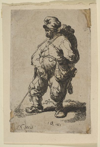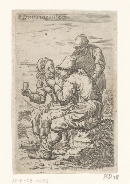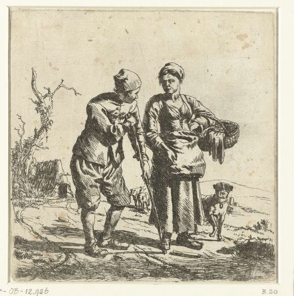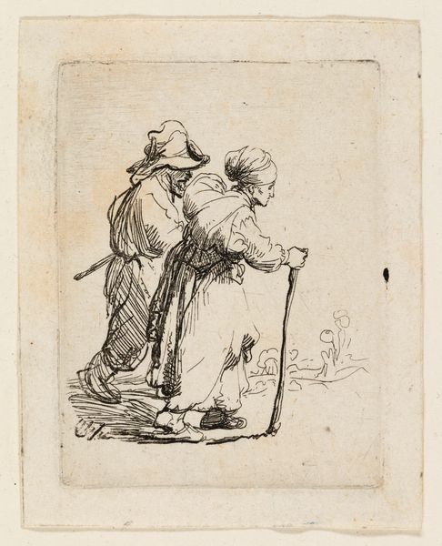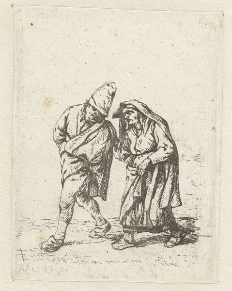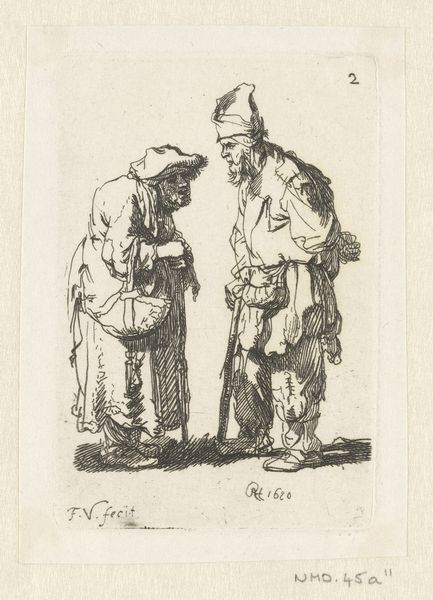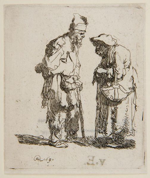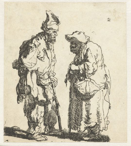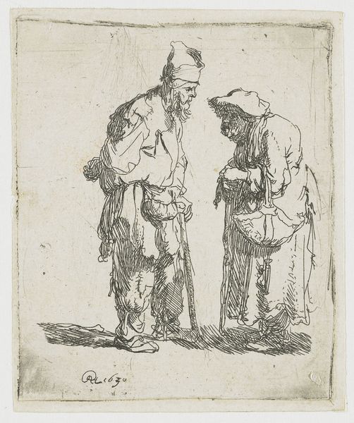 Editor: This pen and ink drawing from 1662, titled "Beggar and Beggar Woman in Conversation" is by Monogrammist JH. There is an immediate intensity to this quick sketch! What catches my attention most are the aged, lined faces of the figures—the starkness is captivating. How would you interpret the visual language used here? Curator: Indeed, the lines are striking, aren't they? Look closer at the beggars' postures. Notice the woman's hunched back and the man's reliance on his walking stick. These aren't just details of their physical state but symbols of their societal position, their vulnerability. The attire further emphasizes that point. These elements tell us about 17th-century Dutch attitudes toward poverty. It can be easily connected with other artwork themes such as memento mori. What emotional impact do these recurring symbols evoke in you? Editor: I guess I'm seeing their interaction as something more than just two people talking. Their expressions seem almost theatrical, heightened. Does that suggest any coded message beyond mere representation? Curator: Precisely! Think about the theatrical tradition of the time. Beggars often appeared as stock characters, used to convey moral or satirical messages. JH uses familiar types, exaggerating their features, prompting us to reflect on compassion, wealth disparity, and perhaps even the fleeting nature of fortune. It becomes less a portrait and more a commentary, using universally understood symbols to spark recognition and introspection. Is it only the appearance that allows you to tell us about their poverty? Editor: This conversation shifted my initial reaction. I was primarily seeing it only as a genre sketch. Now I'm beginning to glimpse a whole symbolic system, almost like a staged encounter intended to provoke thought about the human condition. Curator: And that's the beautiful power of art—how initial impressions can deepen into richer understandings. Looking through this lens reveals these figures as enduring symbols of hardship and resilience across time.